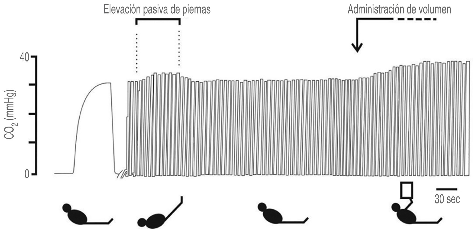 Es una prueba que predice si el GC aumentará con expansión de volumen. Al transferir un volumen de 300 mL de sangre venosa aproximadamente desde la parte inferior del cuerpo hacia el corazón derecho. El CO2 espirado o espiratorio final se determina principalmente por el flujo sanguíneo pulmonar (subrogado del GC), la producción metabólica del CO2 (VCO2) y la ventilación, por lo que la ETCO2 varia directamente con VO2 y el GC e inversamente proporcional con la ventilación alveolar. Por lo tanto, durante la maniobra de levantamiento pasivo de piernas la tasa metabólica sistémica permanece constante, los cambios en ETCO2 deberían reflejar predominantemente las variaciones en el flujo sanguíneo pulmonar y, por tanto, indirectamente, los cambios en el gasto cardíaco(10). Toupin y colaboradores(11) realizaron un estudio prospectivo y observacional, que incluyó a 90 pacientes con uso de ventilación mecánica, en los cuales se implementó maniobra de elevación pasiva de piernas, donde definieron a un paciente respondedor a líquidos como aquel con un aumento del 15% del GC. La respuesta a líquidos se asoció con una variación de ETCO2 (?ETCO2) de ≥ 2 mmHg durante el levantamiento pasivo de piernas (odds ratio [OR] 7.3, intervalo de confianza de 95% [IC95%] 2.7-20.2, p ≤ 0.01), con sensibilidad de 75%, valor predictivo positivo de 54% y valor predictivo negativo de 86%. El área bajo la curva ROC para el incremento del gasto cardíaco y ETCO2 tras la maniobra de elevación pasiva de piernas (0.97 ± 0.03, IC95% 0.85-0.99; y 0.94 ± 0.04, IC95% 0.82-0.99). Un aumento > 5% en ETCO2 o ≥ 12% en el gasto cardíaco durante la elevación pasiva de piernas predijo la capacidad de respuesta a fluidos con una sensibilidad del 90.5% (IC95% 69.9-98.8) y 95.2% (IC95% 76.2-99.9), respectivamente, y una especificidad de 93.7% (IC95% 69.8-99.8)(11-14) (Figura 3).
