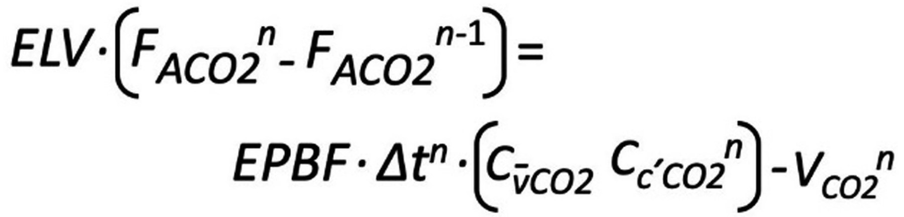 Este patrón de respiración cíclica proporciona múltiples entradas en la ecuación de diferencial de Fick, siendo necesario un ajuste de la ecuación con la finalidad de mantener un flujo sanguíneo pulmonar efectivo (EPBF) con cada nueva respiración(27). Las matemáticas del método corregirán continuamente las fuentes de error que surjan entre las presiones parciales de CO2 al final de la espiración y la presión parcial de CO2 arterial medidas. Ésta es una fuente teórica de error en capnotracking, donde los cambios en el volumen pulmonar efectivo tenderán a aumentar conforme los cambios en la perfusión pulmonar.