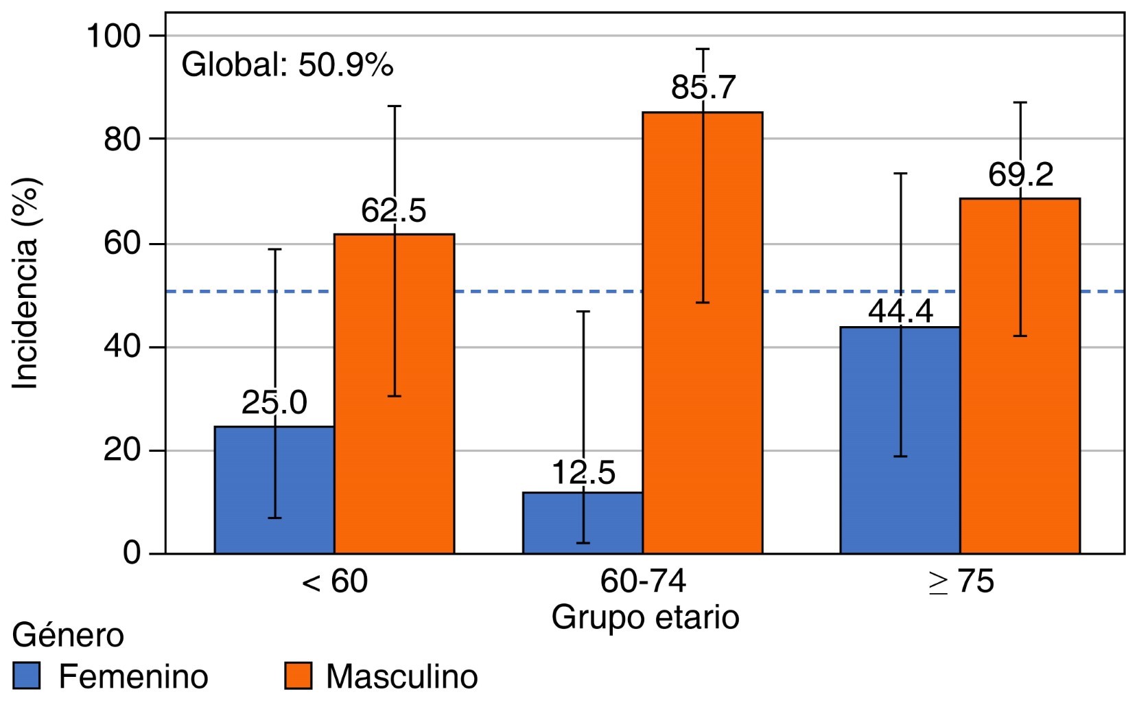 Se analizaron 53 pacientes egresados de la UCI, con una incidencia global del síndrome post-UCI de 50.9% (intervalo de confianza de 95% [IC95%] 37.9-63.9). Por grupos etarios, la incidencia fue de 50.0% en menores de 65 años, 38.5% en 65-74 años y 59.1% en ≥ 75 años, con tendencia a mayor frecuencia en adultos mayores (Figura 1).