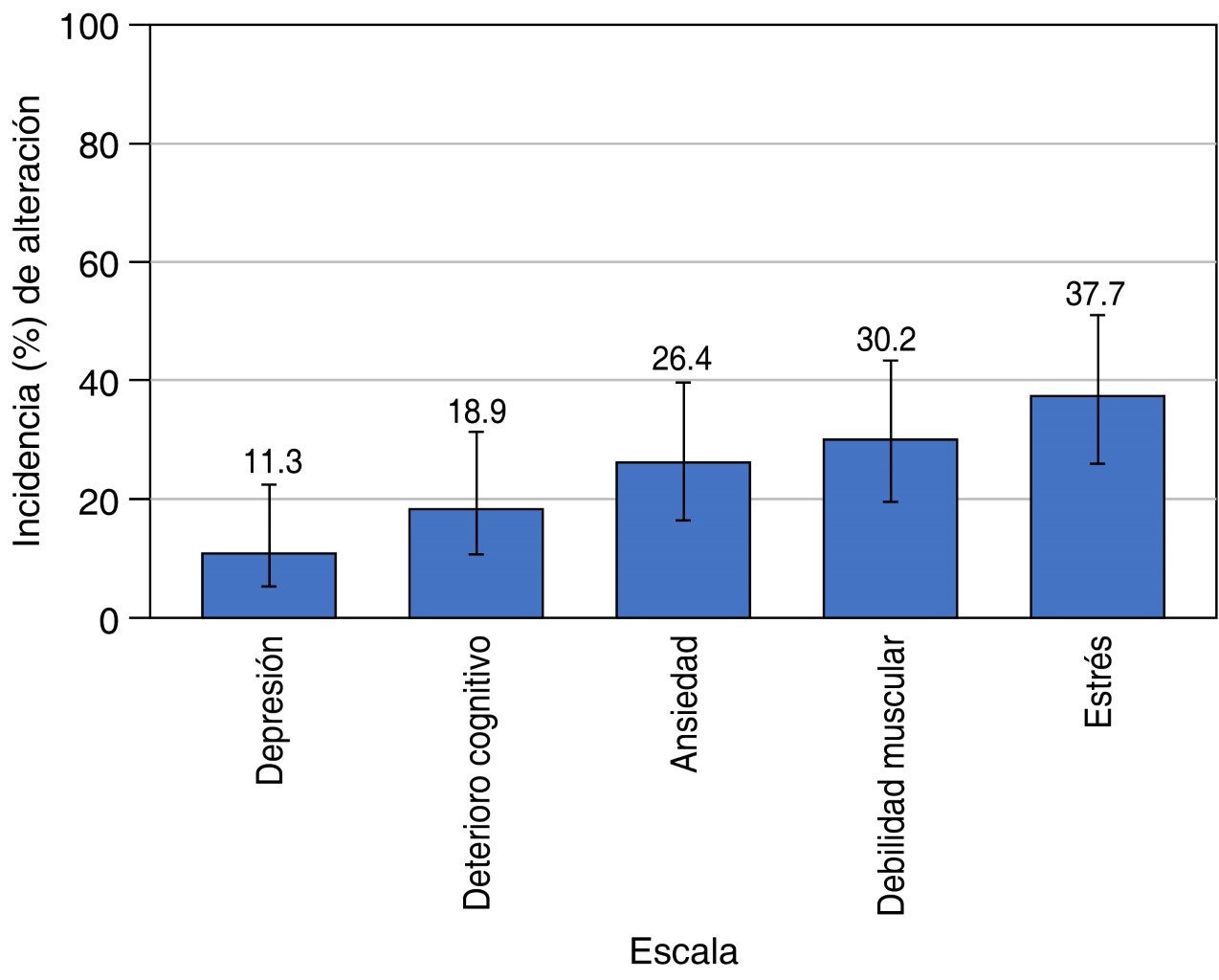 En este estudio se documentó una incidencia del síndrome post-UCI (SPUCI) de 50.9% en pacientes adultos egresados de la unidad de cuidados intensivos, valor que coincide con lo reportado en la literatura internacional, donde las prevalencias oscilan entre 30 y 60%, dependiendo de la población, las definiciones operativas y los instrumentos utilizados para la evaluación.4-6 Esta frecuencia elevada confirma que el SPUCI constituye un problema clínico relevante y persistente, con impacto funcional, cognitivo y psicológico en los sobrevivientes de la enfermedad crítica.