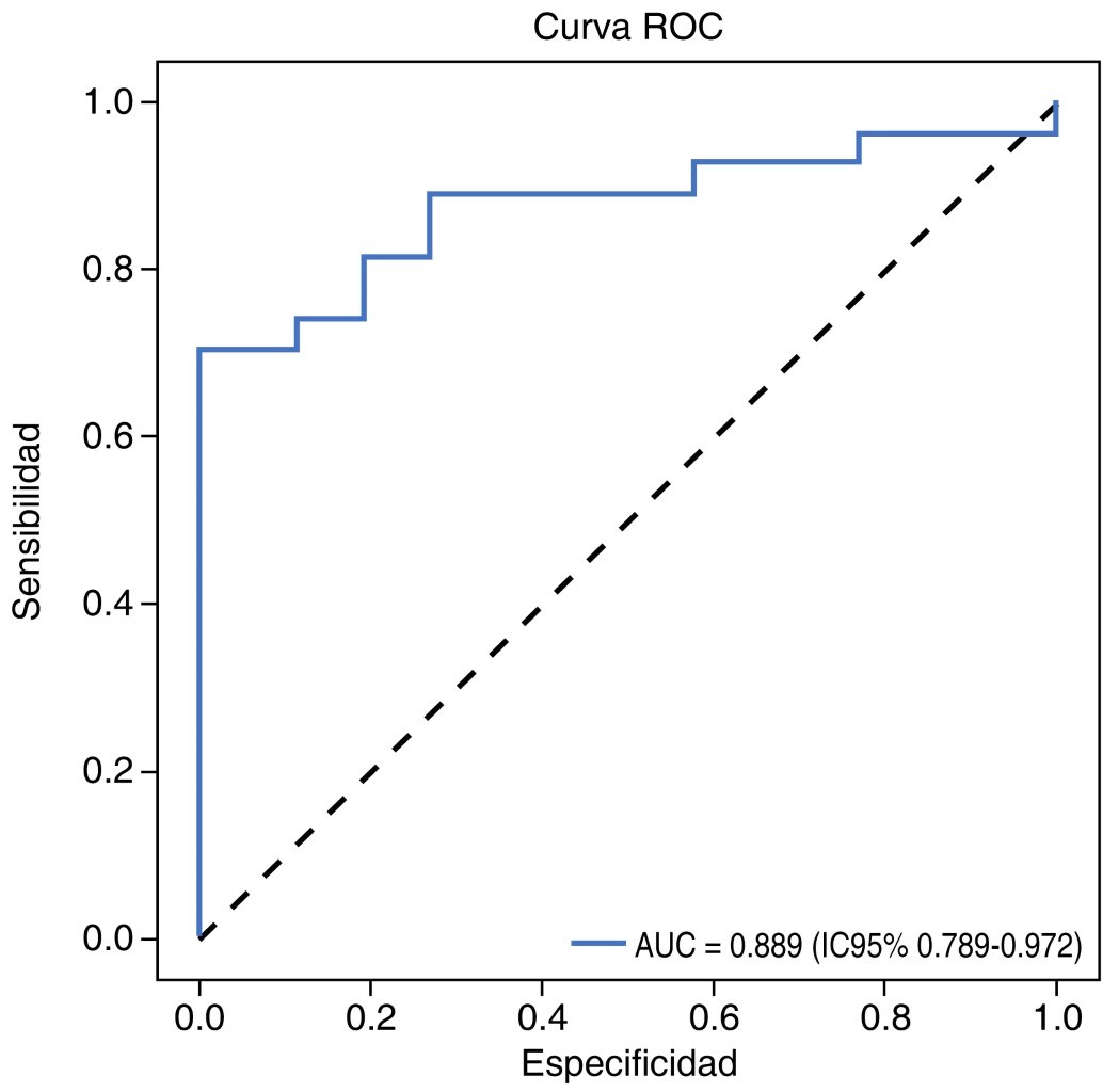 El mejor punto de corte del modelo fue 0.625, el cual se determinó mediante el método de Youden, que correspondió a una sensibilidad de 70.4% y una especificidad de 100%.