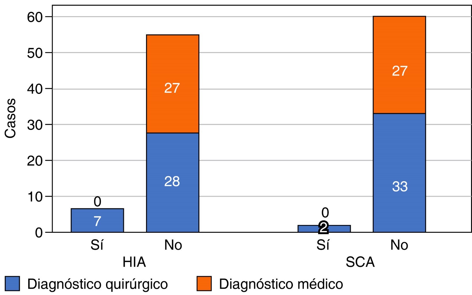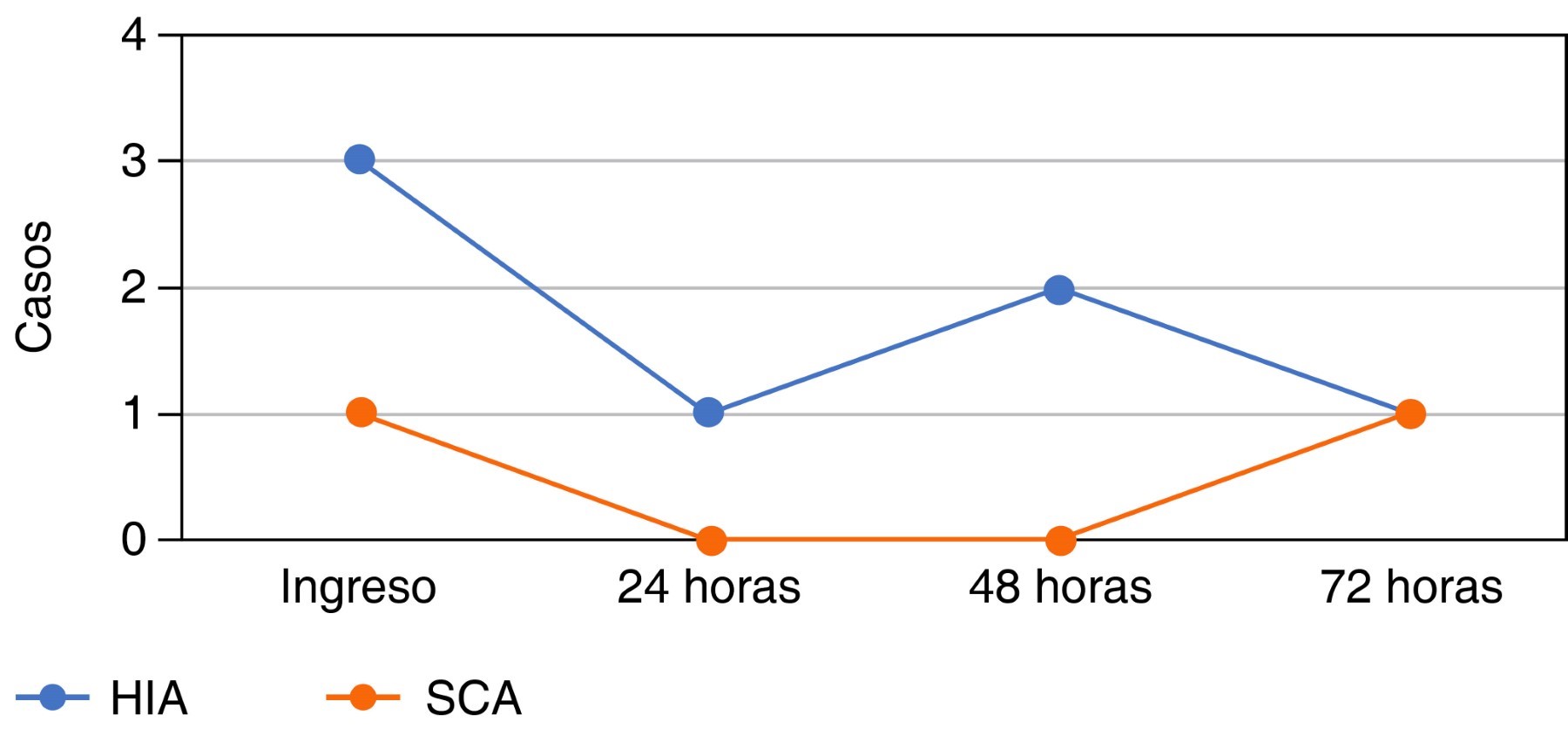Se presentaron siete (11.3%) casos de HIA. De estos casos, en dos pacientes se observó el desarrollo de SCA, lo cual comprende 3.2% del total de la muestra y ocupan 28.5% en aquellos que desarrollaron HIA.