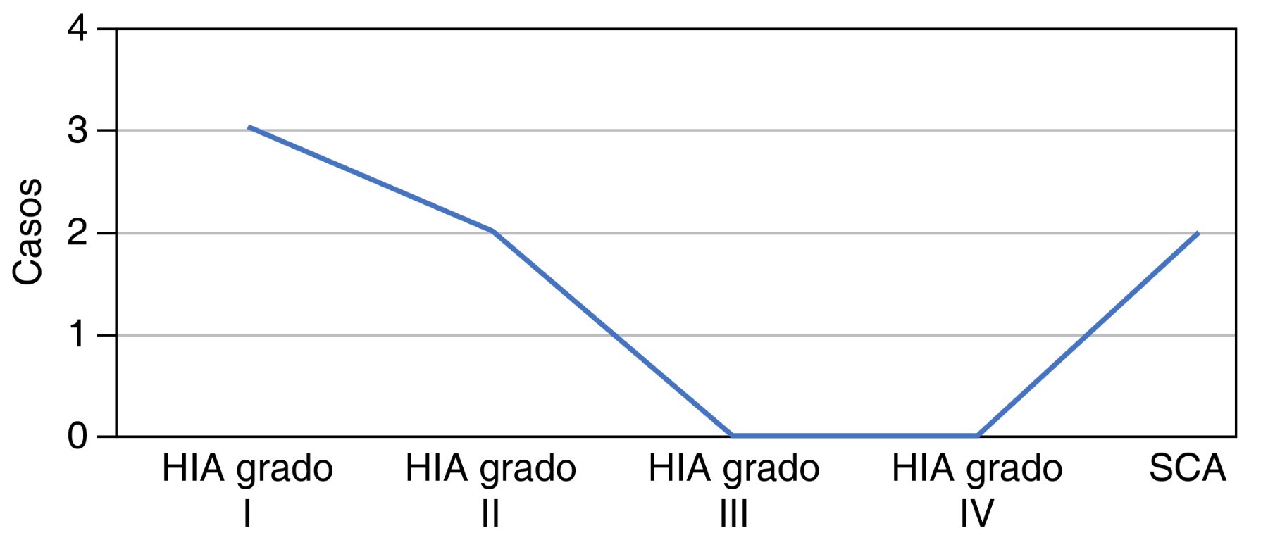 En cuanto a la afección orgánica dependiendo del grado de HIA, se observó que puede haber afección multiorgánica desde los grados I y II de HIA, y aunque en el SCA la afección en el número de órganos es menor, el impacto sobre la evolución de los pacientes es mayor dado el impacto en la función de los órganos afectados, observándose que la presencia de falla cardiovascular se acompañó de falla respiratoria y renal, aunque esta última en uno solo de los casos (Tabla 2).