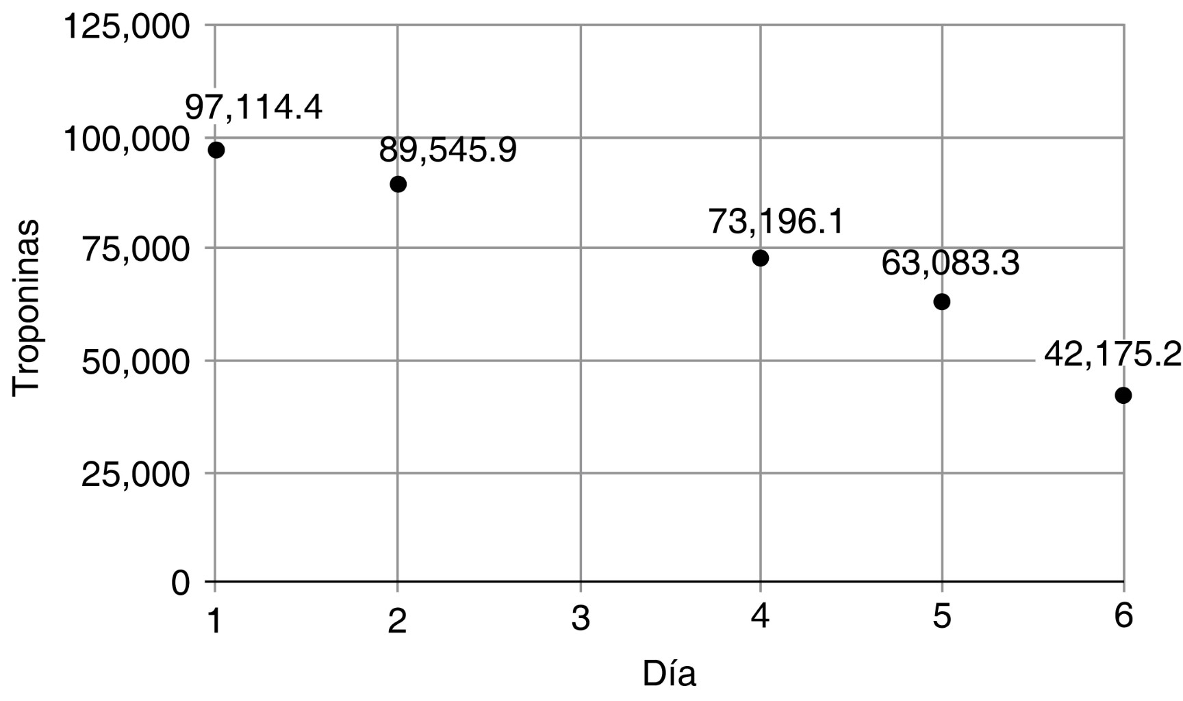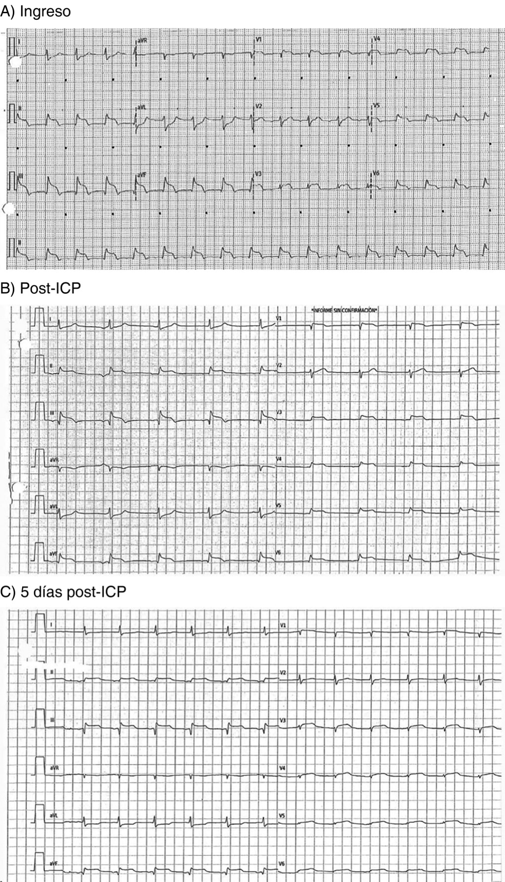 Se efectuaron mediciones seriadas de troponina I ultrasensible con una disminución de 50% del valor inicial al egreso. Desde el punto de vista electrocardiográfico, persistió con elevación del segmento ST en la pared inferior después de la terapia de revascularización coronaria.