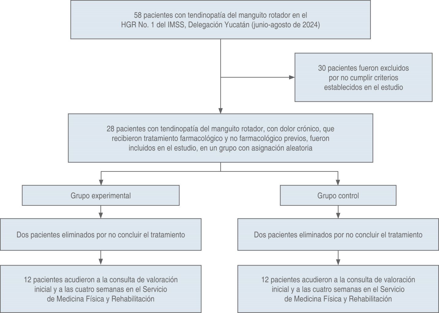 Durante el periodo de junio a agosto de 2024, se identificaron 58 pacientes con diagnóstico de tendinopatía del manguito rotador en el HGR No. 1 del IMSS, con sede en Mérida, Yucatán. De éstos, 28 cumplieron los criterios de inclusión y fueron aleatorizados equitativamente en dos grupos: experimental (n = 14) y control (n = 14), de acuerdo a los criterios de eliminación, dos pacientes de cada grupo fueron eliminados por no concluir el tratamiento, quedando una muestra final de 24 pacientes (Figura 3).