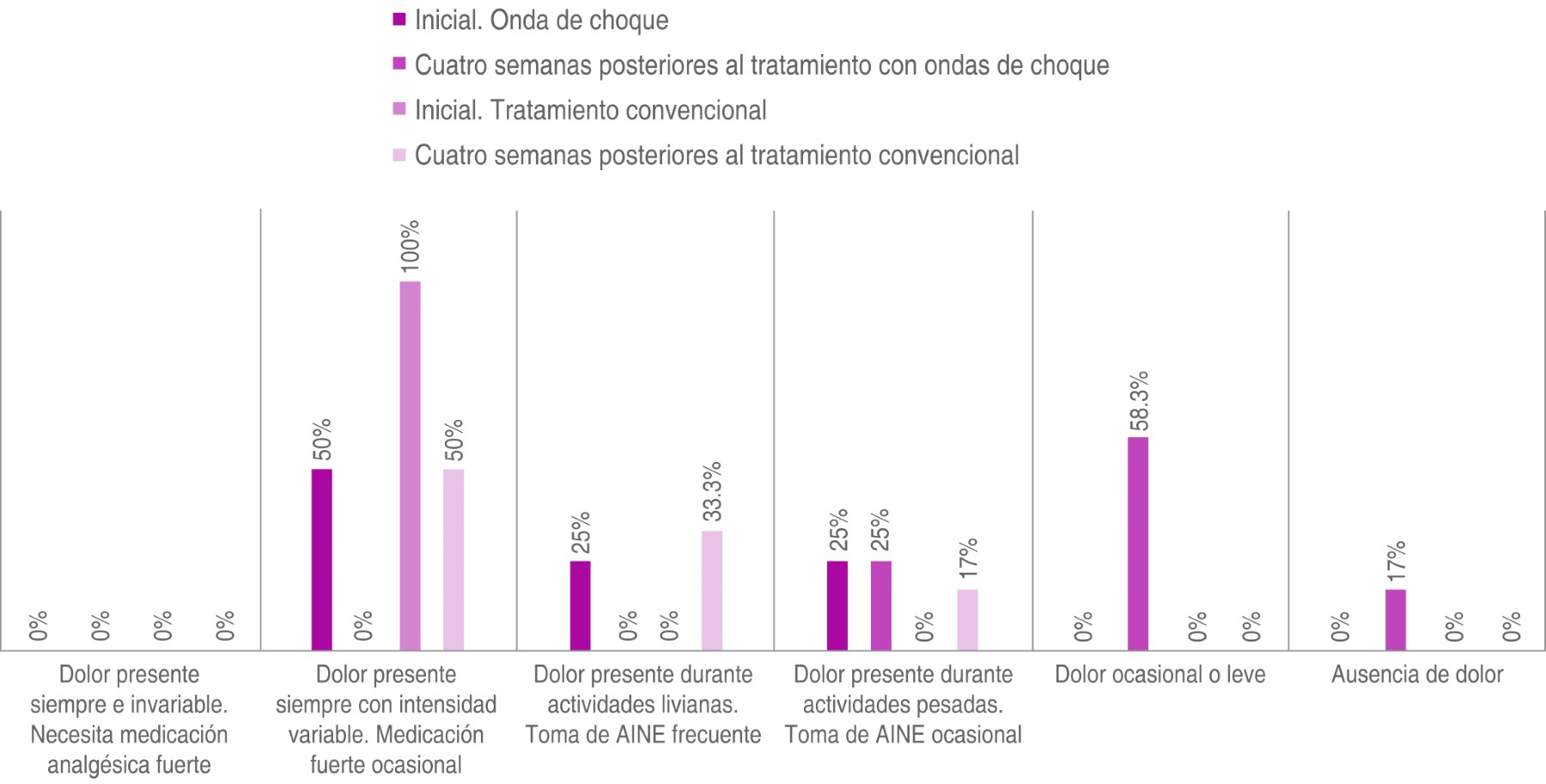 En la evaluación inicial, los 12 pacientes (100%) reportaron dolor constante con intensidad variable y uso ocasional de medicación fuerte. Tras cuatro semanas de tratamiento, seis pacientes (50%) continuaban con dolor persistente, cuatro (33.3%) refirieron dolor durante actividades livianas y dos (16.7%) presentaron dolor durante actividades pesadas con uso ocasional de AINE.