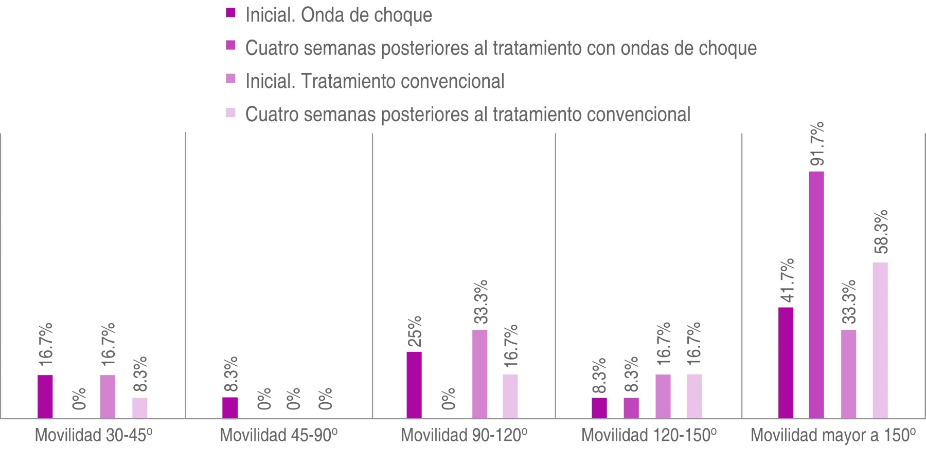En el grupo experimental, se observó una reducción significativa del dolor en la mayoría de los pacientes tras el tratamiento con ondas de choque, acompañado de mejoras funcionales en fuerza muscular y movilidad. La puntuación global en la escala de UCLA mostró que el 83.4% de los pacientes alcanzaron una calificación buena o excelente al finalizar el protocolo. Además, 91.7% lograron flexión anterior mayor a 150°, y el 66.7% alcanzó fuerza muscular normal.