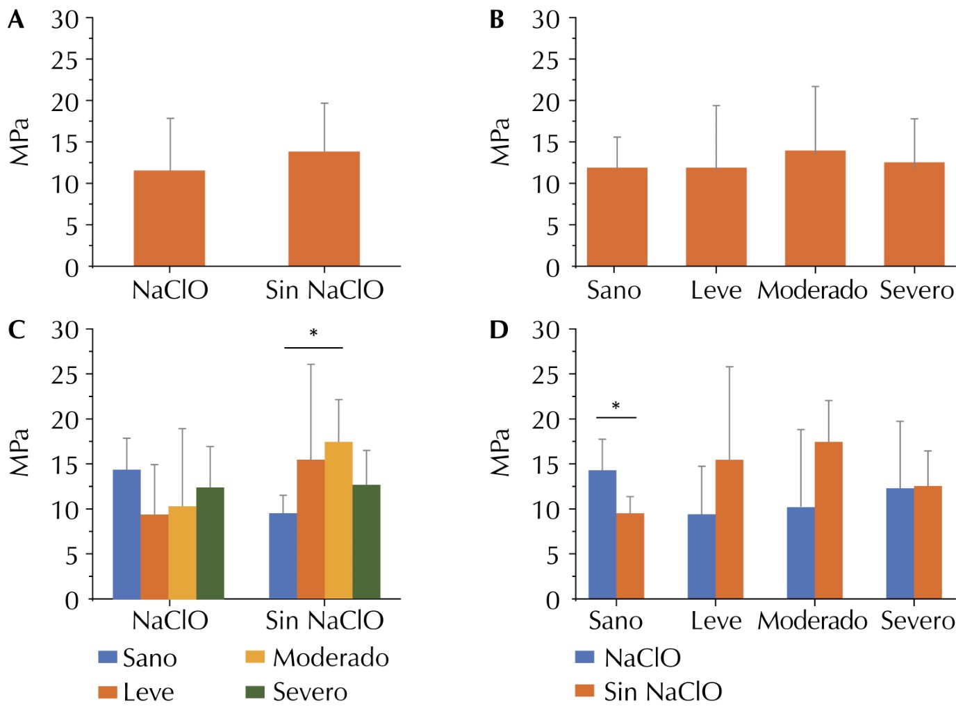 Tras las pruebas estadísticas, se encontró significancia estadística en la comparación del grupo sin desproteinización en el grado sano y el grupo de fluorosis moderada (p < 0.05), la cual mostró los mejores niveles de resistencia al desalojo. Adicionalmente, se identificó que el uso del NaClO únicamente en tejido dental sano mostró significativamente mejores valores de resistencia al desalojo en comparación que la técnica convencional (Figura 2D). Lo anterior sugiere que el uso del NaClO como agente desproteinizante depende en gran medida de la presencia y, probablemente, de la severidad de la fluorosis dental.