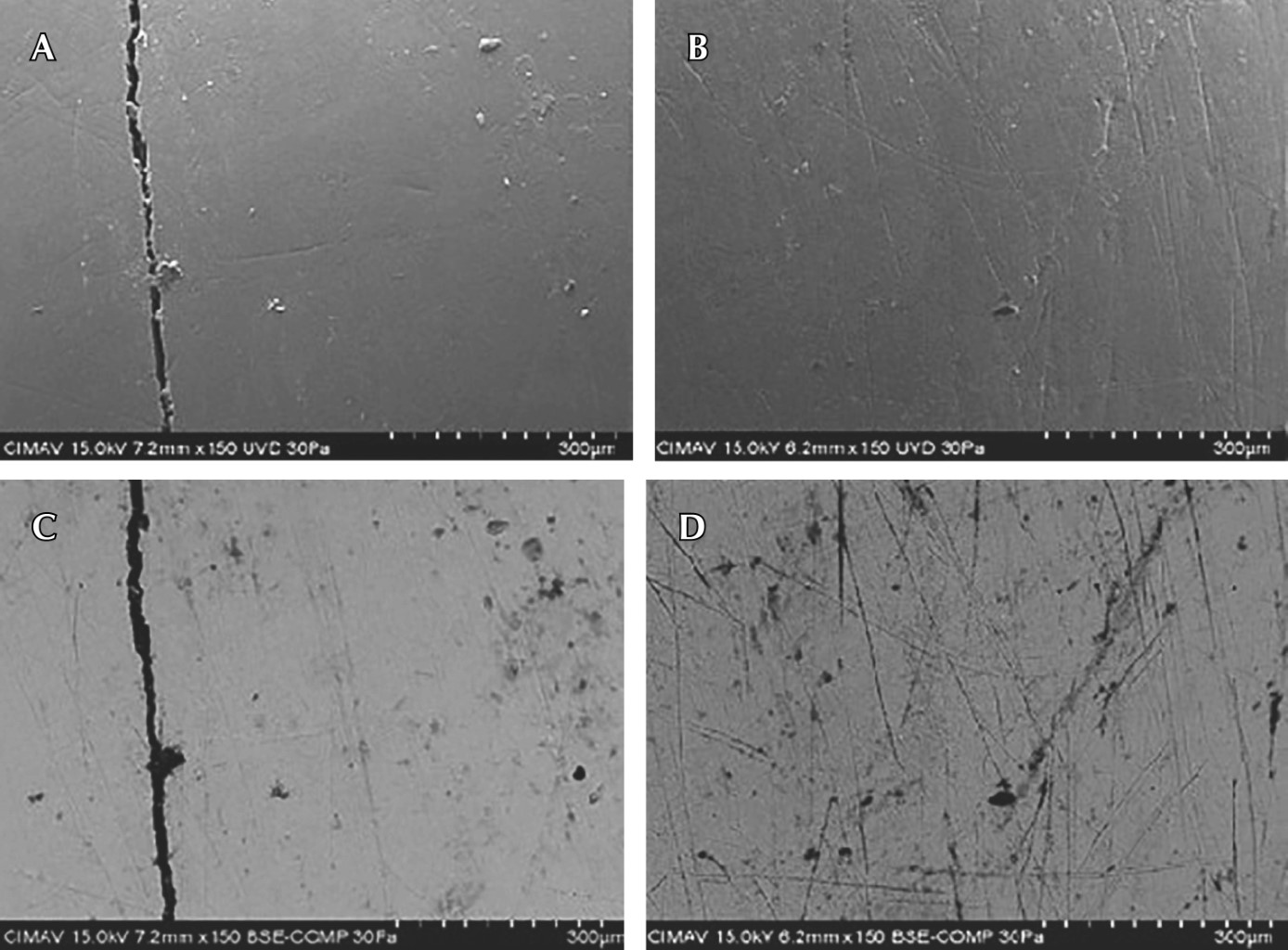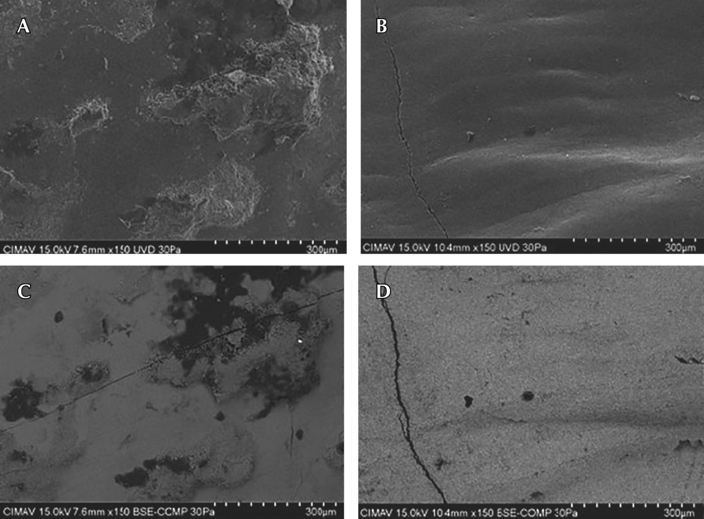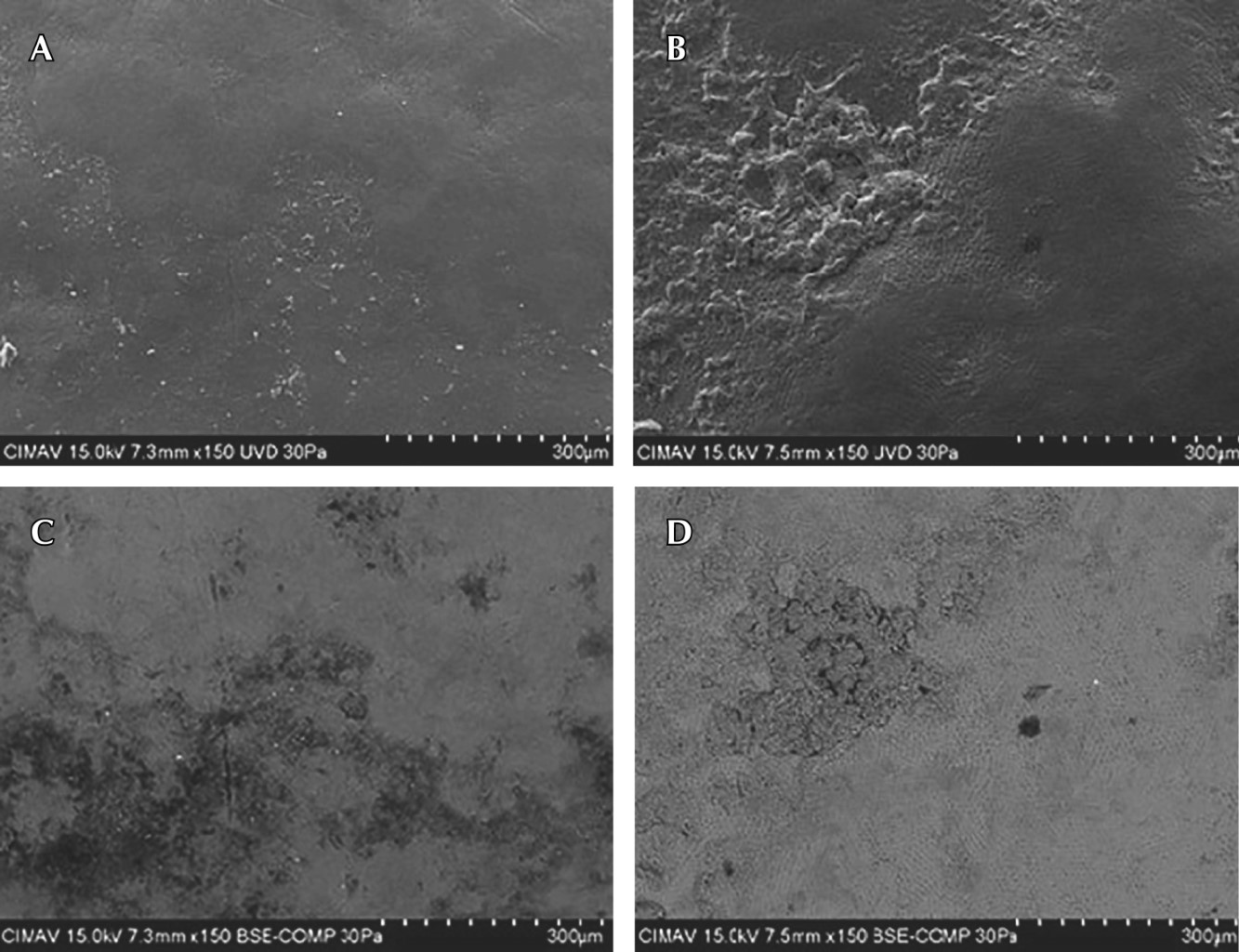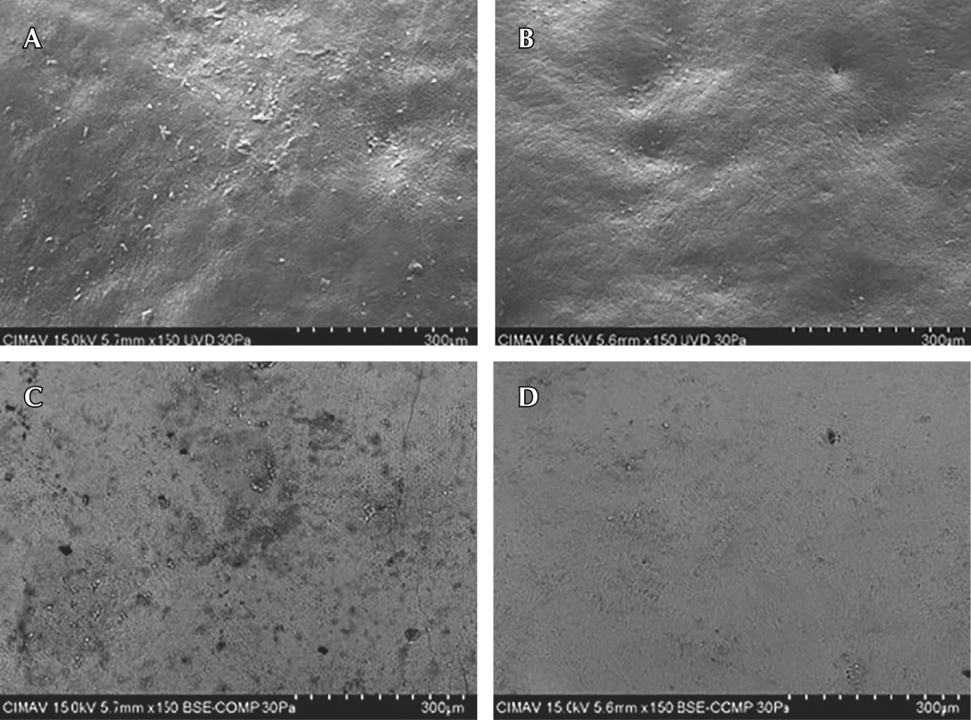 En la muestra de esmalte dental sano se pueden apreciar superficies más homogéneas y con pocas irregularidades en comparación con la muestra con desproteinización (Figura 3A y B). En las micrografías con electrones retrodispersados se observa el esmalte sano con desproteinización, algunas motas o manchas asociadas probablemente con componentes orgánicos que nos brindan superficies porosas con microsurcos (Figura 3C y D).