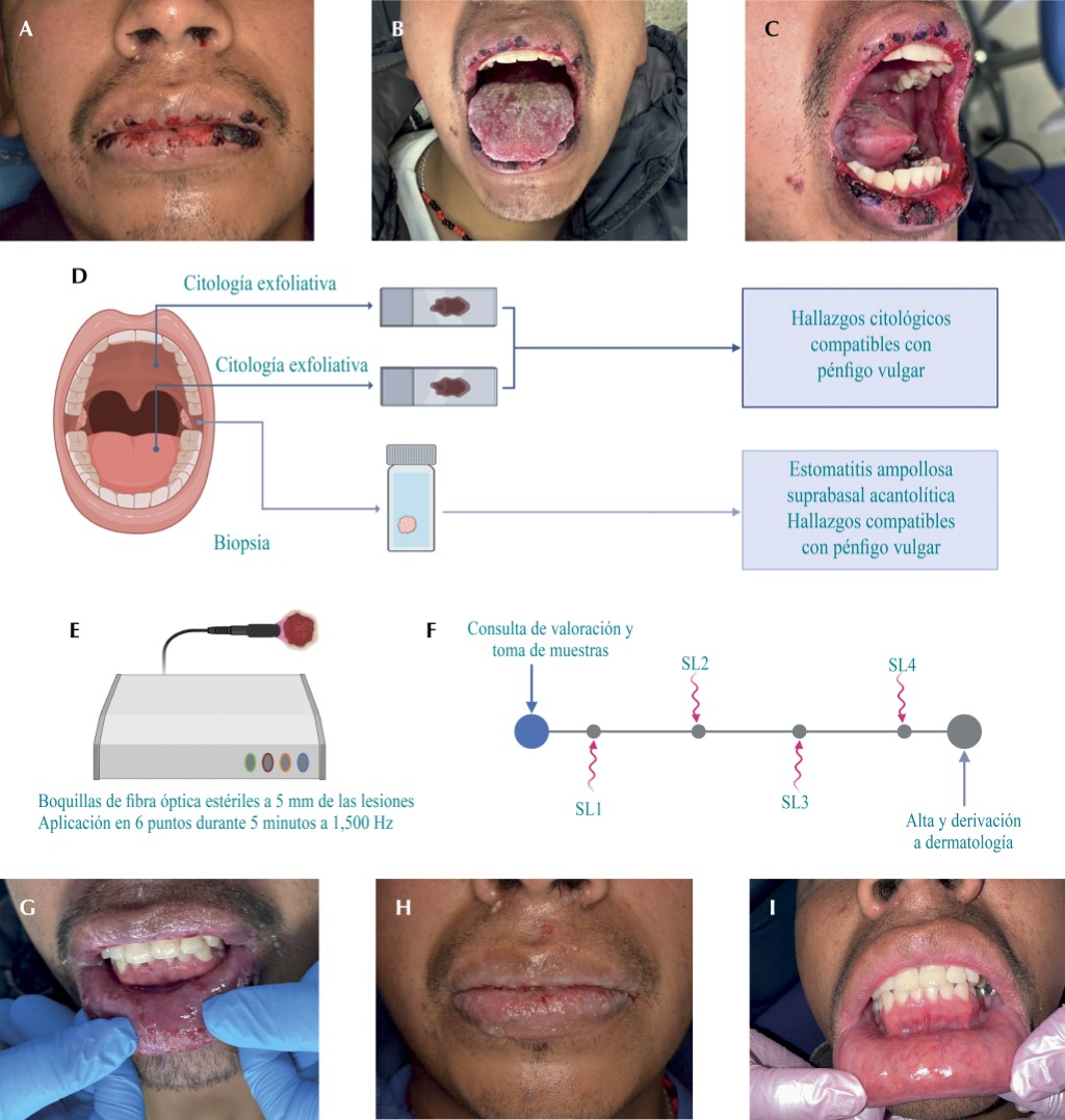 Paciente masculino de 27 años quien acudió a consulta por lesiones ulcerosas distribuidas en mucosa labial, carrillos, el paladar duro, blando, piso de boca y dorso lingual (Figura 1A-C). Las lesiones se caracterizaban por ser eritematosas, ovoides, con presencia de ardor, dolor y sangrado al tacto. Así como úlceras y ampollas en bermellón de forma generalizada. El paciente refiere una evolución de las lesiones de tres meses.