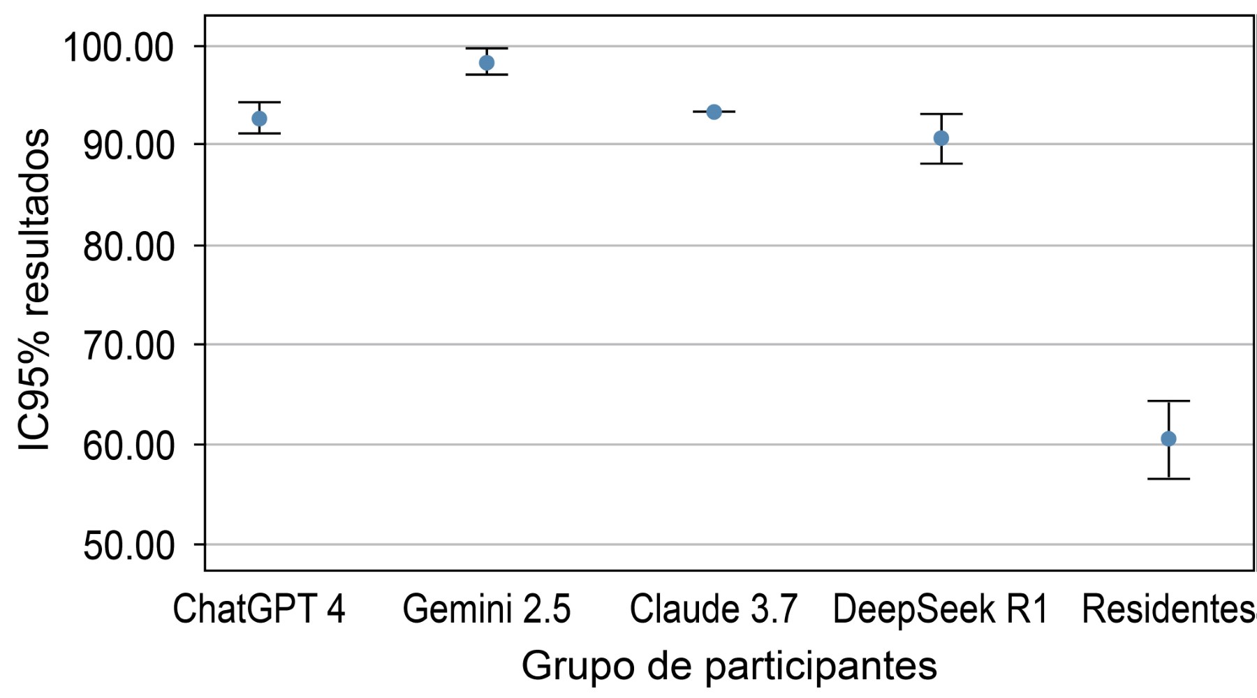 En cambio, no se encontraron diferencias estadísticamente significativas entre ChatGPT 4, Claude 3.7 y DeepSeek R1, lo que sugiere un desempeño similar entre ellos (p > 0.05). Todos los modelos de IA tuvieron un rendimiento significativamente superior al de los residentes humanos, con diferencias que oscilaron entre 30 y 40 puntos (p < 0.001).