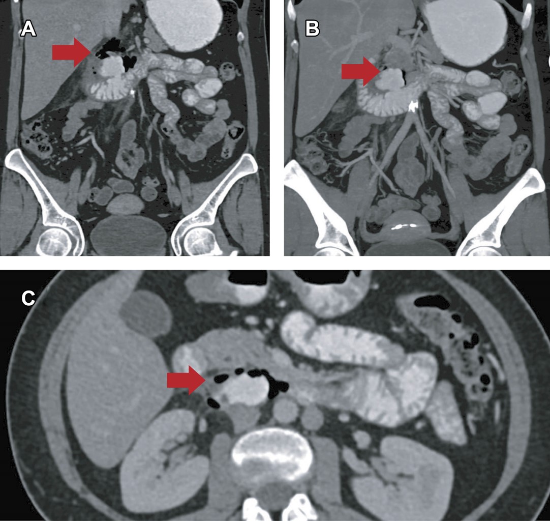 Paciente femenino de 50 años, con antecedente de hipertensión, evento isquémico transitorio y enfermedad por reflujo gastroesofágico; con dos panendoscopias previas. Ingresa a urgencias refiriendo dolor abdominal de cuatro días de evolución, incomodidad postural y distensión abdominal. En la exploración física: peso 63.5 kg, talla 166.3 cm; índice de masa corporal (IMC) 23 kg/m2. Frecuencia cardiaca (FC) 85 lpm, frecuencia respiratoria (FR) 21 rpm, temperatura 35.7 °C, saturación de oxígeno 92%, presión arterial (TA) 113/66 mmHg. Neurológicamente íntegra; escala de Glasgow 15 puntos. Cardiopulmonar sin compromiso. Abdomen blando, depresible, con dolor a la palpación superficial y profunda del hipocondrio derecho (escala visual analógica [EVA] 8/10), rebote positivo, sin datos de irritación peritoneal; con disminución en la peristalsis. Se solicitan estudios de laboratorio e imagen, así como abordaje por cirugía general. Los resultados de laboratorio indicaron leucocitosis, elevación de los reactantes de fase aguda (Proteína C Reactiva [PCR], Procalcitonina [PROCA]) y desnutrición proteico-calórica/hipoalbuminemia (Tabla 1), en tanto que la tomografía abdominal evidenció divertículo duodenal con perforación contenida (Figura 1).