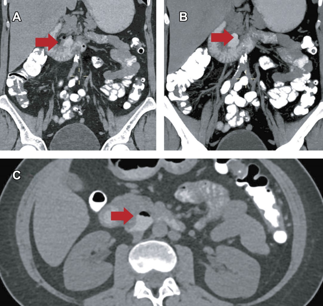 El diagnóstico oportuno de una perforación diverticular resulta crucial para determinar un manejo conservador. Para identificar un divertículo duodenal y una perforación de este tipo de divertículos se requiere un buen examen clínico, pruebas de laboratorio, así como pruebas de imagen con cortes finos (tomografía computarizada [TC]). La TC es la prueba de referencia para el diagnóstico de divertículo duodenal perforado.3 Los hallazgos radiológicos a tomar en cuenta son: engrosamiento de la pared duodenal ≥ 4 mm, estriación de grasa mesentérica y aire/líquido extraluminal o retroperitoneal.3 De acuerdo con lo presentado, nuestra paciente no mostró datos de irritación peritoneal debido a que el crecimiento estaba a nivel retroperitoneal, lo que causaba síntomas vagos; el diagnóstico se realizó mediante el protocolo de TC.6 La ausencia de fuga de contraste oral demostró que el divertículo estaba contenido; el riesgo de someter a la paciente a una cirugía de urgencia era mayor que los beneficios que podía ofrecer.3
