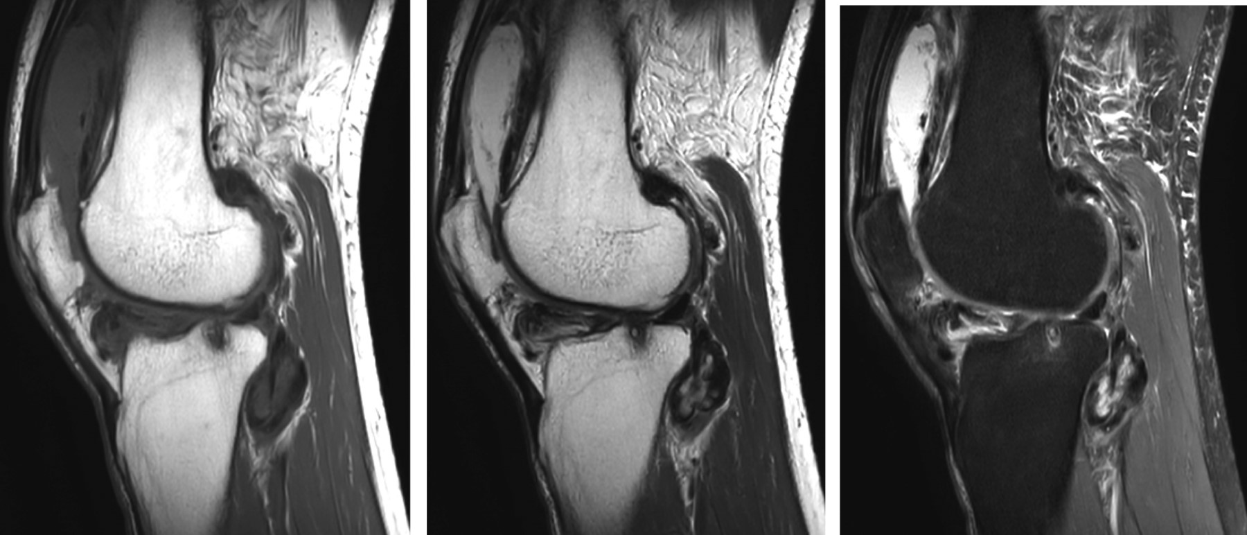 Se realizó estudio de resonancia magnética (Figura 1), en el que se identificó aumento de volumen de los tejidos blandos y aumento de la cantidad de líquido sinovial, el cual se observa heterogéneo, con presencia en su interior de imágenes ovoides, de bordes bien definidos y de baja intensidad de señal en T1 y T2. Se observa afectación del compartimento posterior, posterior a las fibras del ligamento cruzado posterior, posterior al borde posterolateral de la tibia, en la topografía de la grasa de Hoffa, posterior al cóndilo femoral lateral y en la región suprapatelar.
