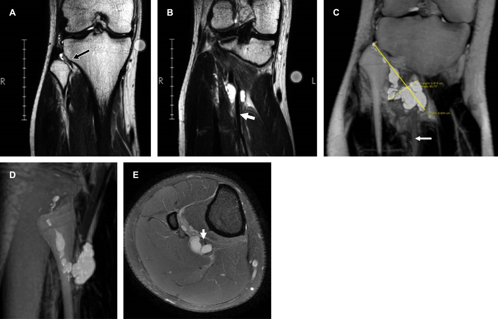 Los gangliones son lesiones pseudotumorales de aspecto quístico, de paredes regulares y bien definidas, se presentan como masas de partes blandas en tejidos yuxtaarticulares, pueden aumentar o reducir espontáneamente su tamaño intermitentemente, pueden ser uni o multilobulados, de contenido espeso, gelatinoso o mucoide; provienen de la degeneración de un quiste sinovial o de degeneración mucoide de tejido conectivo yuxtaarticular secundario a lesión postraumática.1 Son más frecuentes en jóvenes entre los 20 y 40 años, con predominio en el sexo femenino con relación 3:1; su incidencia varía con su localización. En cuanto a su presencia en la articulación tibioperonea proximal,2 Ilahi y colaboradores3 lo reportan en 0.76%, cuando se encuentra en esta localización, los reportes indican puede existir compresión del nervio ciático poplíteo externo y/o nervio peroneo,2-4 siendo extraordinaria la compresión del nervio tibial.
