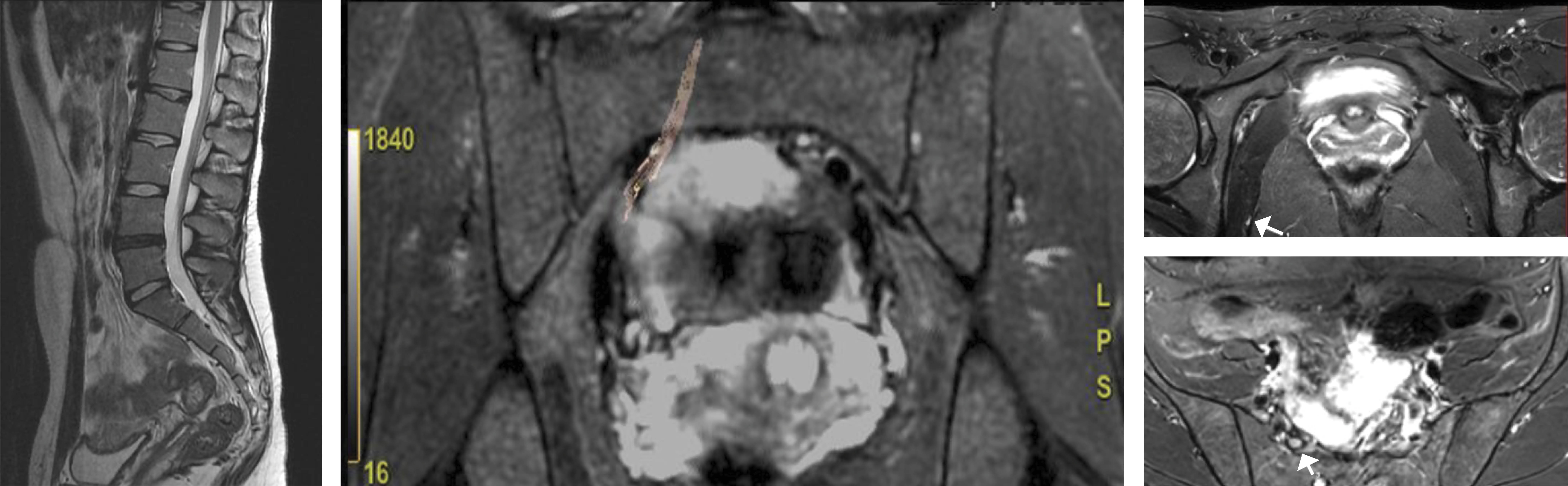 Se realizó resonancia magnética, en la cual se evidenció degeneración y protrusión discal a nivel L4-L5, así como hidrartrosis derecha de 1 mm. Con el objetivo de descartar compresión nerviosa, se continuó el protocolo diagnóstico mediante tractografía, la cual no demostró datos de compresión a lo largo del trayecto del nervio; sin embargo, mostró hallazgos sugestivos de neuritis y congestión pélvica (Figura 1).