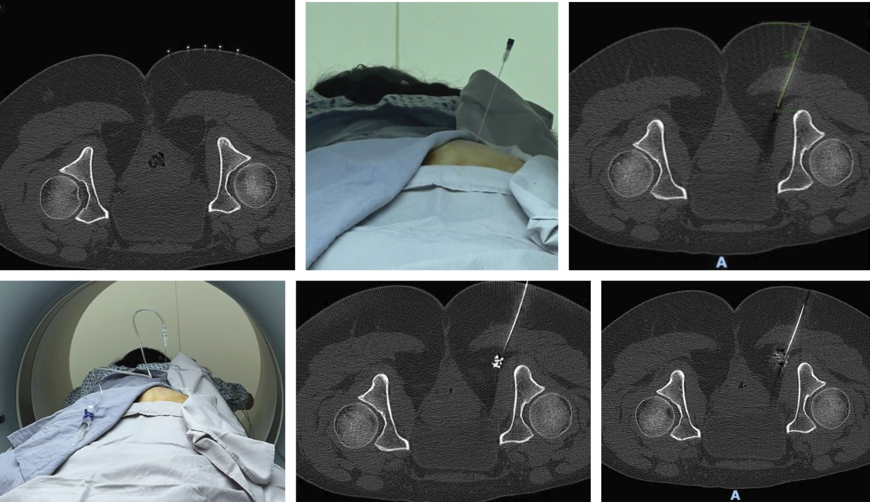 Se propuso el bloqueo analgésico del nervio pudendo guiado por tomografía. Se realizó el marcaje con rejilla guiado por tomografía, tomando como referencia la espina ciática y el área glútea, se introdujo aguja espinal y se confirmó la localización con el uso de medio de contraste (Figura 2).