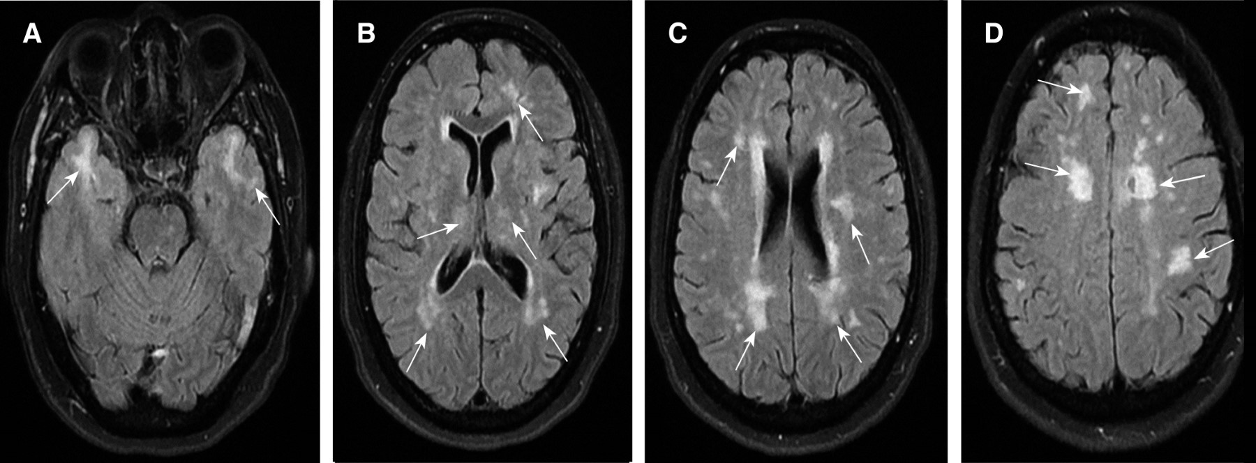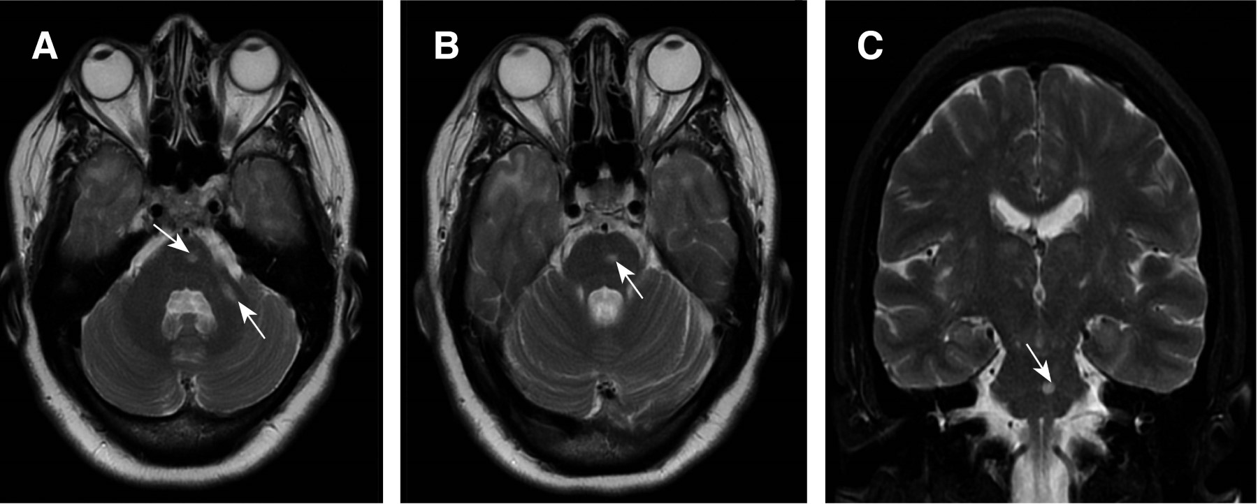A los 46 años presentó súbitamente aumento de la debilidad hemicorporal derecha y disartria, se realizó IRM cerebral encontrando en secuencia T2 lesiones hiperintensas en sustancia blanca a nivel del bulbo, puente y pedúnculo cerebeloso inferior izquierdo (Figura 1) y en secuencia fluid-attenuated inversion recovery (FLAIR) lesiones hiperintensas en sustancia blanca superficial y profunda en ambos polos temporales, parietal y frontal bilateral, periventriculares, periatriales, adyacentes a la ínsula y en cuerpo calloso (Figura 2), sugestivos de EVC isquémico en territorio de la arteria cerebral media izquierda en su segmento M2. Los exámenes de laboratorio y gabinete, incluyendo proteína C y S, antitrombina III, factor V de Leyden, angiotomografía de troncos supraaórticos, electrocardiograma, estudio Holter, ecocardiograma, todos dentro de la normalidad. Se realizó estudio genético, el cual reportó mutación del gen NOTCH3 c.544C>T (pL151P). Se inició tratamiento de profilaxis secundaria con atorvastatina y ácido acetilsalicílico e ingresó al programa de rehabilitación física.
