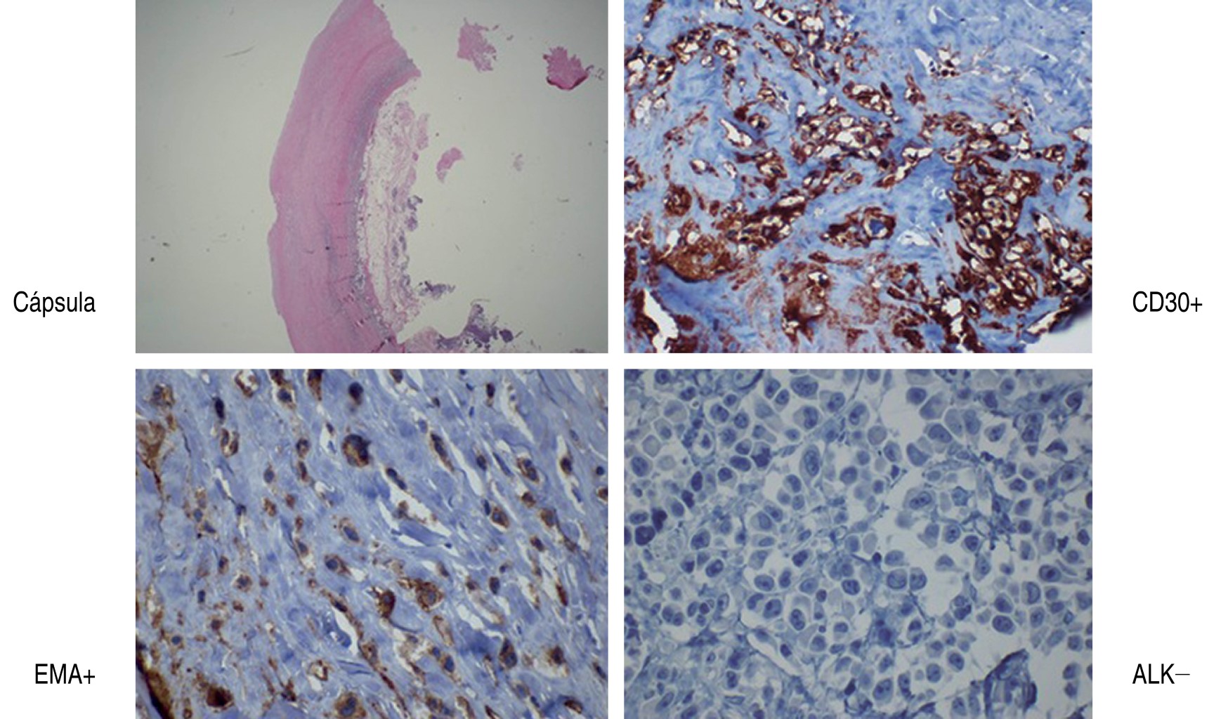 El uso de ultrasonido resulta muy importante para poder aspirar el seroma. El líquido obtenido debe enviarse a cultivo, citológico y citoquímico, y sobre todo debe enviarse a patología. De preferencia se debe avisar al patólogo que se enviará una muestra para que se pueda hacer en las primeras 24 horas; de no ser así, se debe preservar la mitad del mismo con alcohol al 96% para su estudio posterior.8 Este estudio resulta muy útil para poder continuar con el manejo terapéutico. De corroborarse por el patólogo, se realizarán las diferentes tinciones o marcadores, siendo el CD30 el inicial y más importante (Figura 1).