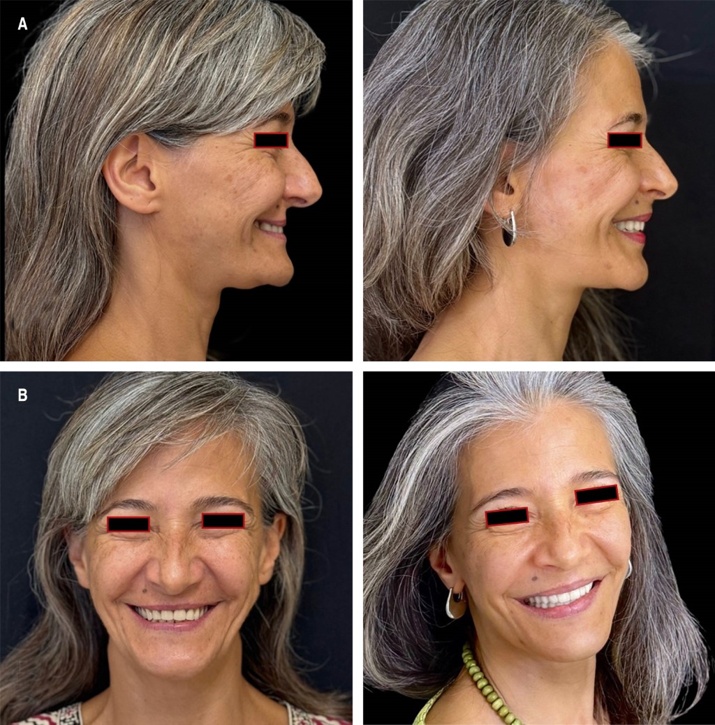 En el plano estético, se observaron mejoras marcadas en la proyección labial, una reducción de pliegues nasogenianos y un perfil armónico del tercio inferior facial, lo cual ha sido evaluado mediante análisis fotográfico pre- y postoperatorio, así como el cuestionario de satisfacción basado en una escala de Likert de 5 puntos, una herramienta común para medir percepciones o actitudes de los pacientes.