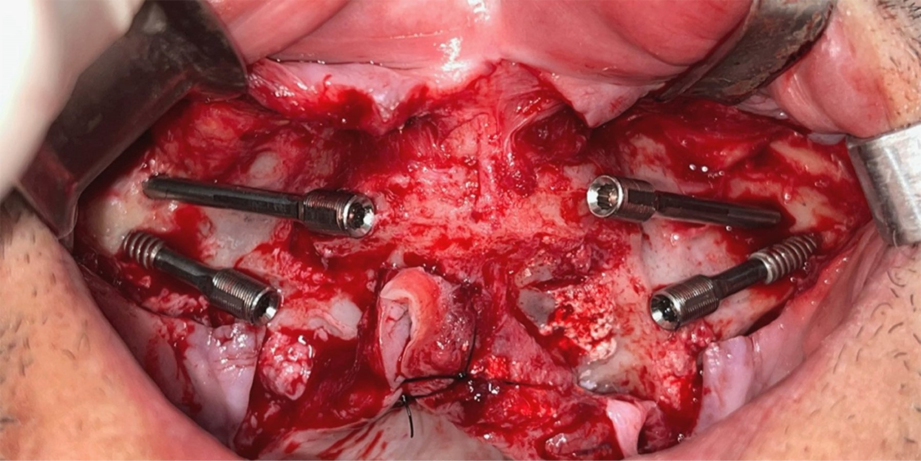 El caso que se ilustra presenta la necesidad de avanzar el maxilar para compensar la discrepancia sagital y, además, dificultad para colocar implantes cigomáticos por tener poco espacio y anatomía desfavorable del hueso malar, muy delgado y de gran concavidad respecto a la delgada cresta residual. Se realizaron guías de perforación, osteotomía y fresado. Los implantes yuxtaóseos se diseñaron de manera tal que combinan osteosíntesis del avance maxilar y portadores de los pilares protésicos para la reconstrucción dentomaxilar.