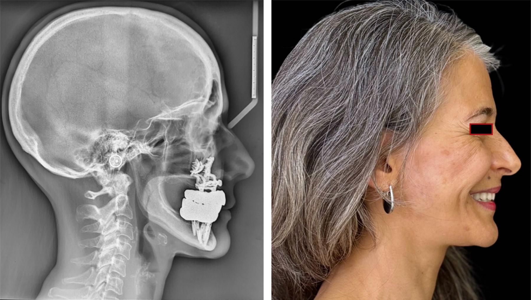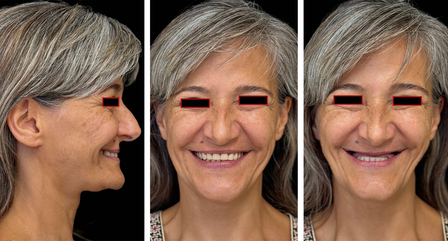 Tal es el caso de la paciente femenina de 50 años, edéntula total desde los 27 años, quien consultó por alteración severa de la estética facial, dificultades masticatorias y sensación de envejecimiento prematuro. El examen clínico evidenció colapso del tercio inferior facial, pérdida de la dimensión vertical y signos avanzados de SEOP (Figura 4). La visión de perfil mostraba retrusión maxilar; incluso con prótesis, el rostro mostraba hundimiento de mejillas y surcos nasogenianos. Sin prótesis, se acentuaban la flacidez y la expresión facial senil. La tomografía volumétrica mostró atrofia maxilar severa con neumatización sinusal, y antecedentes de sinusitis crónica contraindicaron la colocación de implantes cigomáticos intrasinusales.
