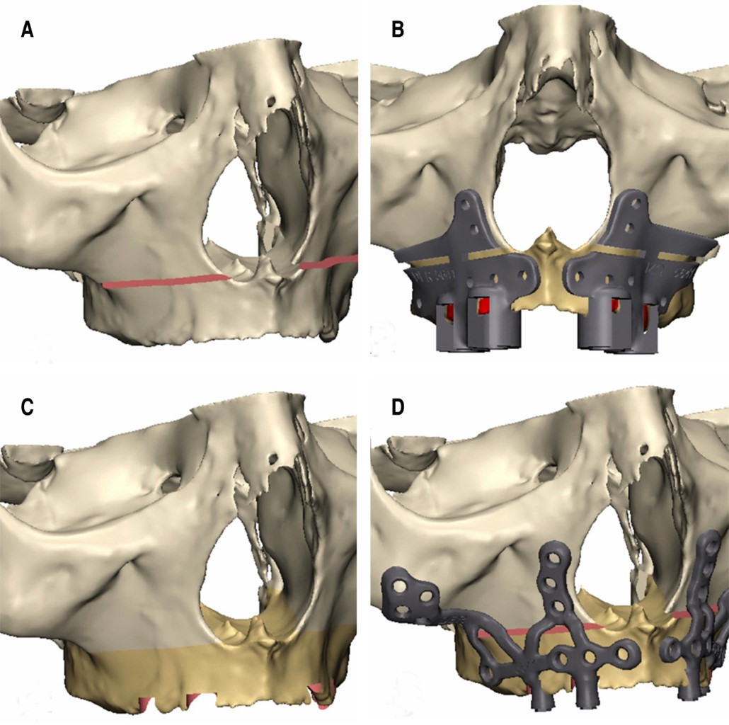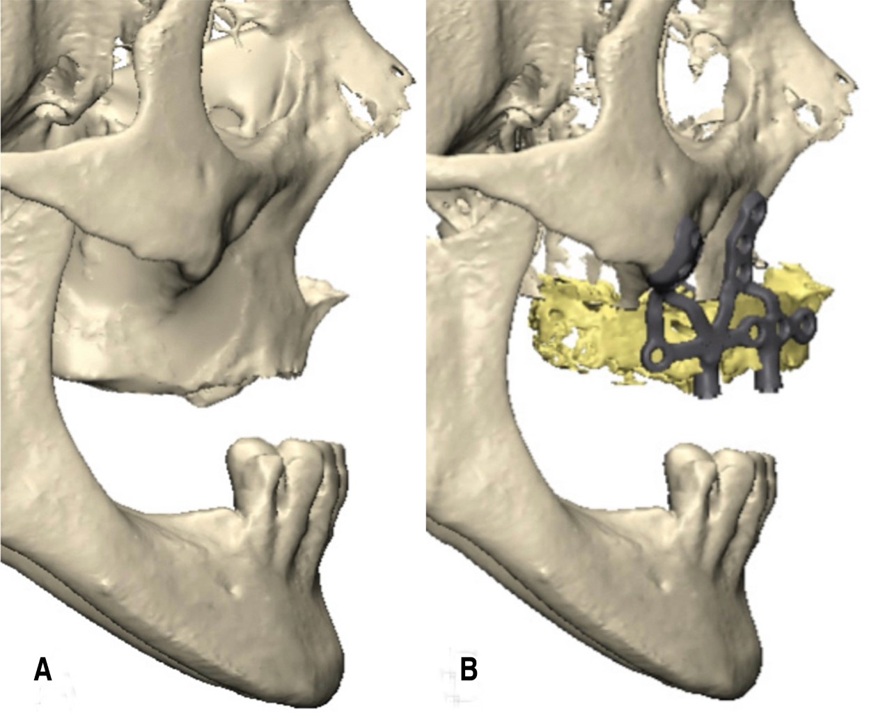Esta técnica representa un recurso clave en el tratamiento del SEOP, especialmente cuando se requiere reposicionar el tercio medio sin alterar estructuras óseas mediante osteotomías. En pacientes con atrofia ósea extrema con contraindicación para técnicas convencionales o cuando la atrofia ósea impide una osteointegración predecible, ha resurgido el interés por los implantes yuxtaóseos personalizados, fabricados mediante impresión 3D.