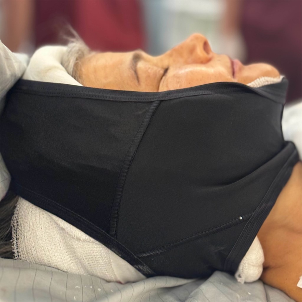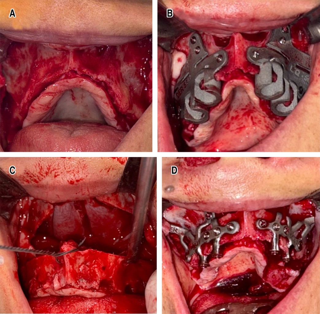 Se decidió un abordaje combinado con osteotomía tipo Le Fort I, con avance maxilar de 10 mm, y colocación de implantes yuxtaóseos personalizados, planificados digitalmente con base en la anatomía remanente. Esta decisión quirúrgica se justificó por la precariedad volumétrica de los huesos malares, que impedía el anclaje bicortical cigomático, sumado a la contraindicación por patología sinusal crónica (Figuras 4, 5, 6 y 7). El procedimiento fue realizado bajo anestesia general, sin complicaciones, utilizando guías quirúrgicas. La cirugía concluyó con procedimiento complementario de ritidectomía (Figura 8).