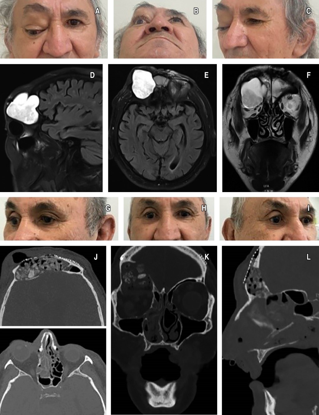 Once meses después de la cirugía, el paciente ha evolucionado favorablemente, sin presentar dolor ni sintomatología en cabeza y cuello. Además, se observa una evidente mejoría de la proptosis en el ojo derecho (Figura 1G a 1L).