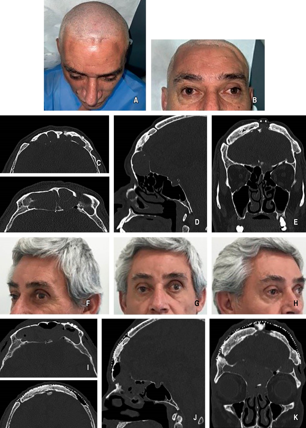 Hombre de 61 años, con antecedente de accidente de tránsito en 2018, que causó una fractura compleja del macizo facial, enucleación del ojo izquierdo y fractura de ambas paredes del seno frontal. El paciente fue intervenido en tres ocasiones: una primera para la reconstrucción del macizo facial, una segunda para cranealización del seno frontal con eliminación de una lesión compatible con mucocele y obliteración con cemento Norian, y una tercera para el retiro de malla y tornillos de osteosíntesis del seno frontal, con eliminación de mucosa y obliteración con cemento quirúrgico aloplástico.