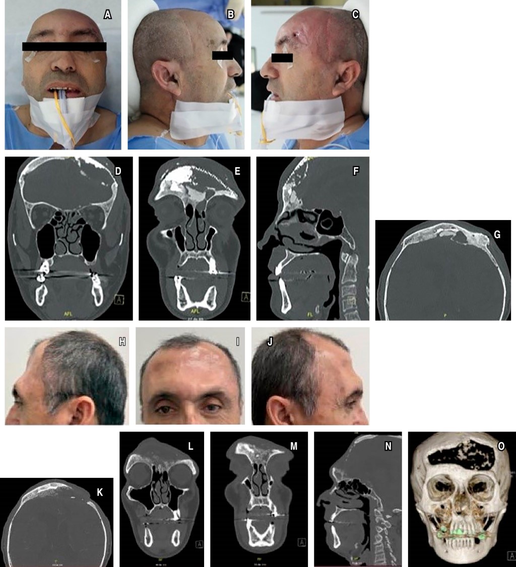 El paciente ha mostrado una evolución favorable, con seguimiento continuo por parte de los equipos de neurocirugía y cirugía maxilofacial durante un periodo de seis meses (Figura 3H a 3J). Se realizó un control imagenológico mediante TAC (Figura 3K a 3O), y se decidió mantener el seguimiento según el protocolo establecido por nuestro establecimiento (Tabla 1).