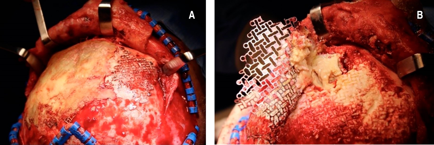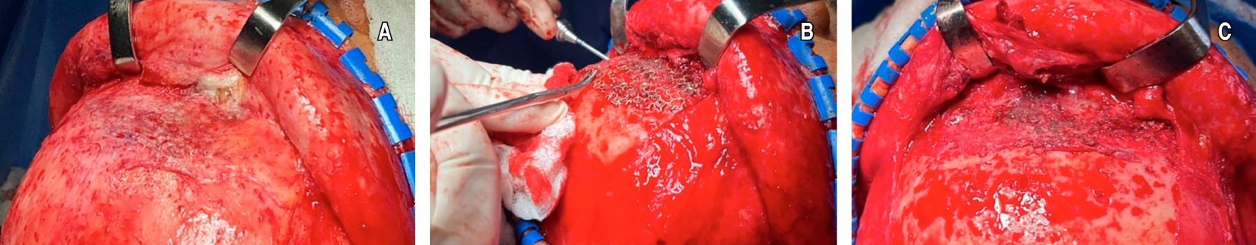 Se realizó un abordaje coronal a través de incisiones previas, seguido de la remoción del material sintético, malla y tornillos de osteosíntesis (Figura 4A), visualizando directamente la presencia de mucocele (Figura 4B). Posteriormente, se llevó a cabo un aseo quirúrgico y la cranealización.