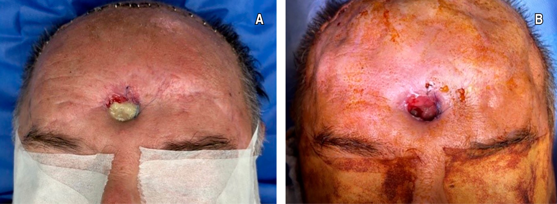 Sin embargo, una semana después de la cirugía, el paciente continúa con exudado purulento proveniente de la fístula frontal, la cual ha aumentado de tamaño, tal como se muestra en la Figura 7. Debido a esto, se programa una segunda intervención para realizar un nuevo aseo y obliteración del defecto con colgajo pericraneal.