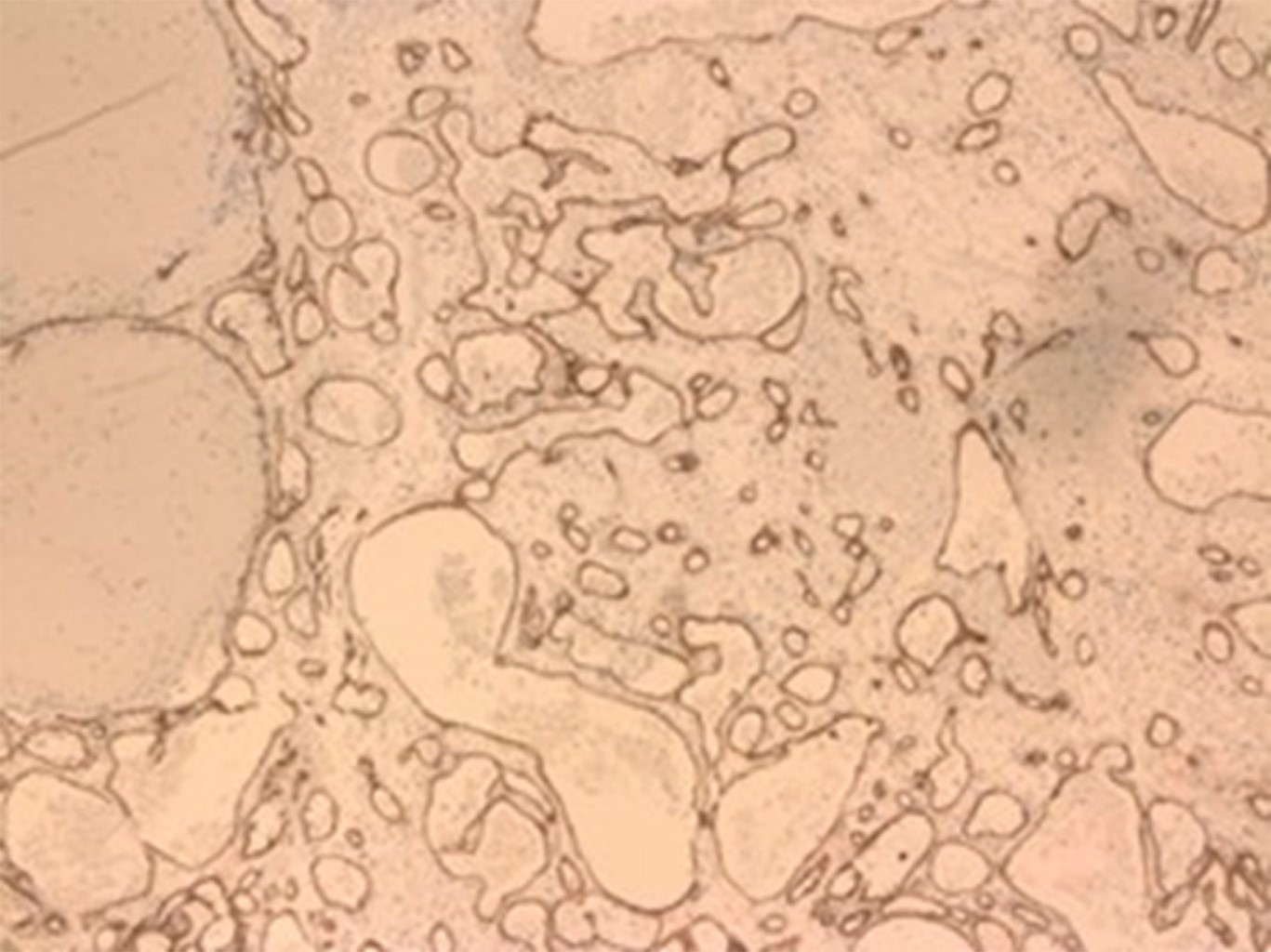 Histológicamente, estas lesiones muestran canales vasculares displásicos sin mitosis activa, diferenciándose de los hemangiomas verdaderos. Además, se ha demostrado un ambiente proangiogénico con expresión aumentada de VEGF, Ang-2, HIF-1α y TIE2, lo que favorece la fragilidad capilar y el sangrado.5,6