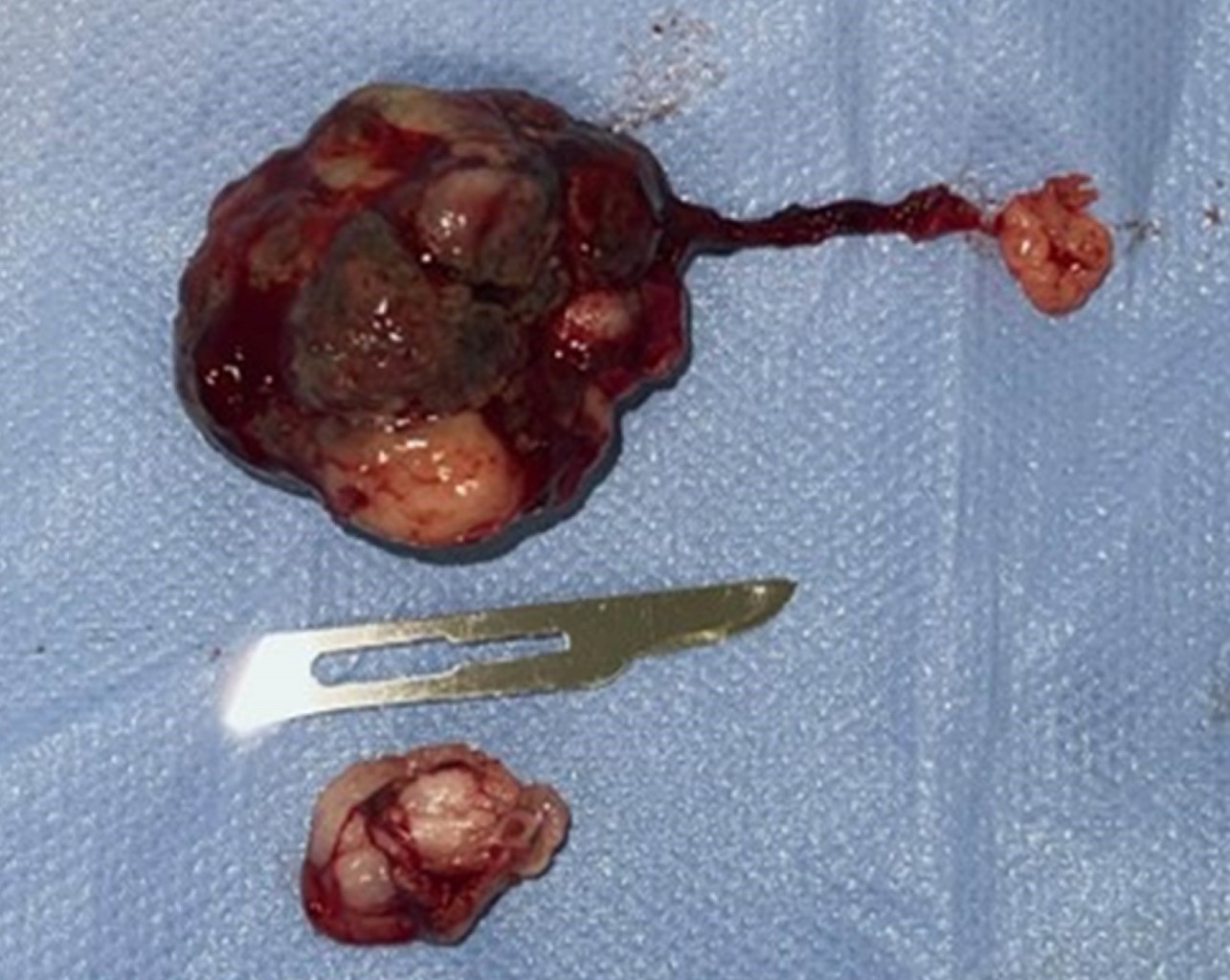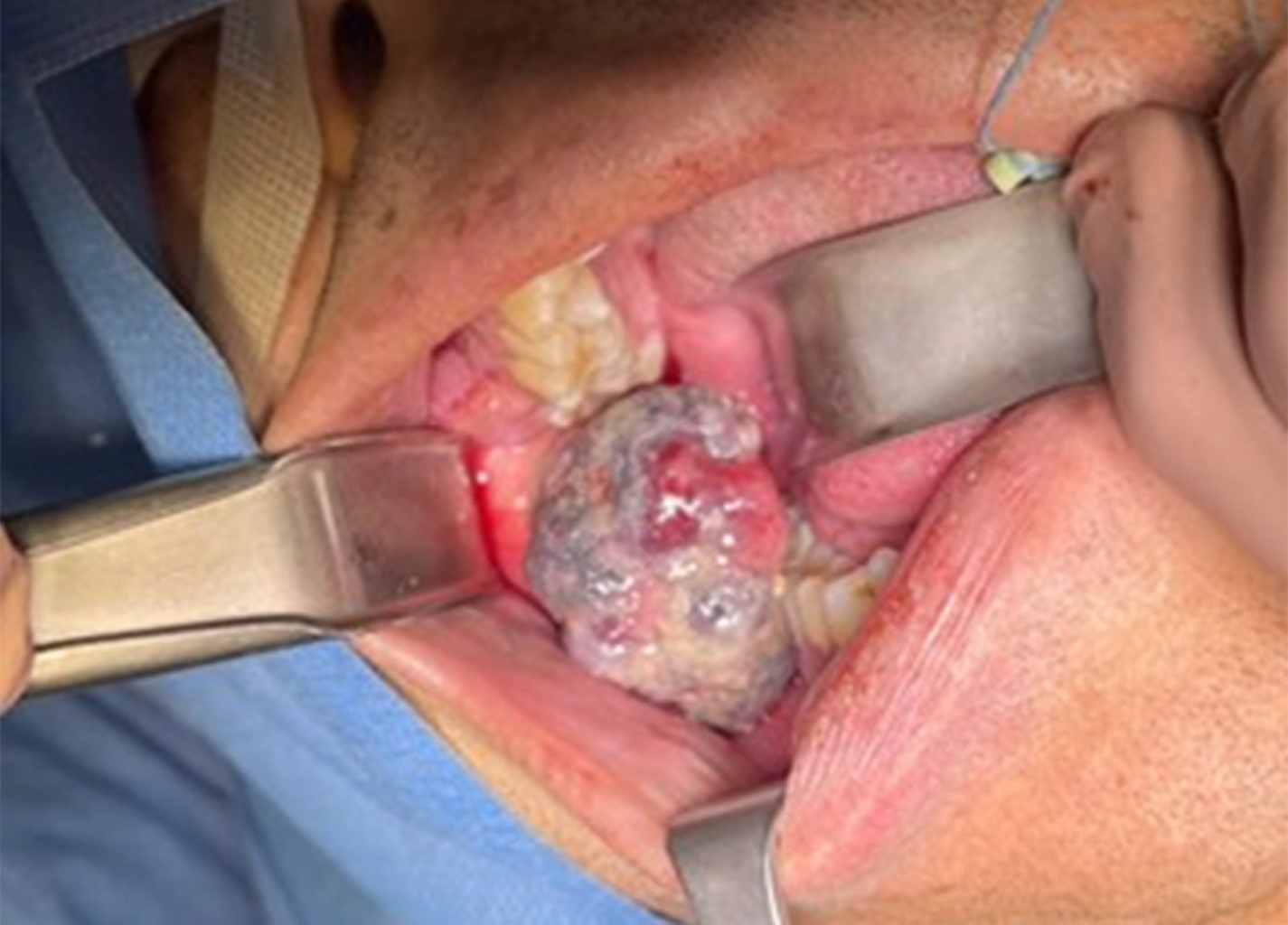 El 25 de mayo de 2025 se realizó el procedimiento exéresis de la lesión de más de 3 cm en relación a diente 4.8 (Figuras 4 y 5) bajo anestesia general sin complicaciones. En control del 23 de junio de 2025 se constata buena cicatrización y ausencia de recidiva. Se indica seguimiento periódico.
