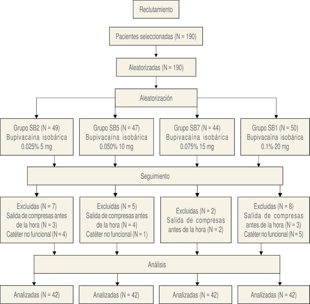 Grupos de estudio: grupo SB2 (bupivacaína 0.025% 5 mg), grupo SB5 (bupivacaína 0.05% 10 mg), grupo SB7 (bupivacaína 0.075% 15 mg) y grupo SB1 (bupivacaína al 0.1% 20 mg). La eficacia anestésica se evaluó con la escala numérico verbal (EVN), considerando si hubo necesidad de complementar la dosis intratecal, del minuto 60 hasta la salida de las compresas, necesidad de una dosis de rescate (lidocaína simple 0.5% 100 mg) por mala efectividad de la DAS, requerimiento de una segunda DAS y en el postquirúrgico inmediato. Al finalizar la cirugía se aplicaron las escalas de Aldrete, Bromage y Ramsay.