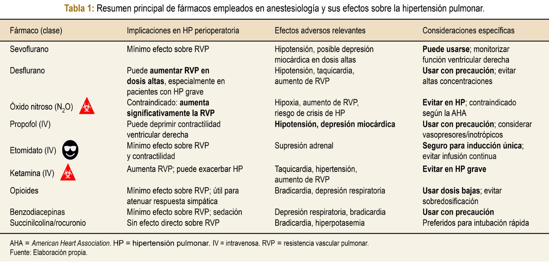 El manejo anestésico intraoperatorio debe centrarse en tres objetivos fundamentales(1,2): optimizar la presión arterial pulmonar, mantener una precarga adecuada del VD y evitar el fallo ventricular derecho. En este contexto, las guías actuales enfatizan que la preservación de la función del VD debe considerarse el objetivo central del manejo anestésico perioperatorio en estos pacientes. Para ello, es prioritario prevenir situaciones que incrementen la RVP, como la hipoxia, la hipercapnia, la acidosis, el dolor o la sobrecarga de volumen. Factores como la hipercapnia, la hipoxia y la acidosis aumentan la RVP, mientras que la hipocapnia, el aumento de la fracción inspirada de oxígeno y el pH alcalino la reducen.