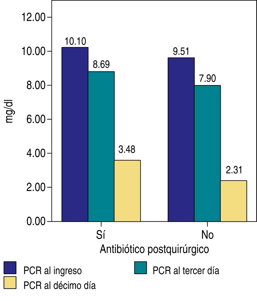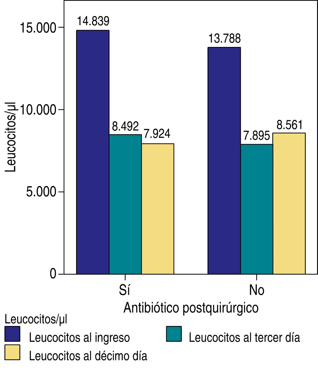 En donde sí observamos diferencias es en la estancia hospitalaria, lo cual coincide con lo reportado por Coakley y colegas,13 asimismo, dicho autor establece que sí existen diferencias entre el recuento leucocitario de los pacientes con antibióticos postquirúrgicos versus pacientes sin antibióticos postquirúrgicos, lo cual se contrapone con lo reportado en nuestro estudio en donde no observamos diferencias en el recuento leucocitario y PCR. El presente estudio corrobora las aseveraciones antes comentadas en el que se confirma que no existen diferencias para prevenir las infecciones de sitio quirúrgico entre los pacientes operados por apendicitis aguda no complicada utilizando y no utilizando antibióticos postquirúrgicos, de este modo, el comportamiento bioquímico (leucocitos y PCR) de los pacientes es el mismo.