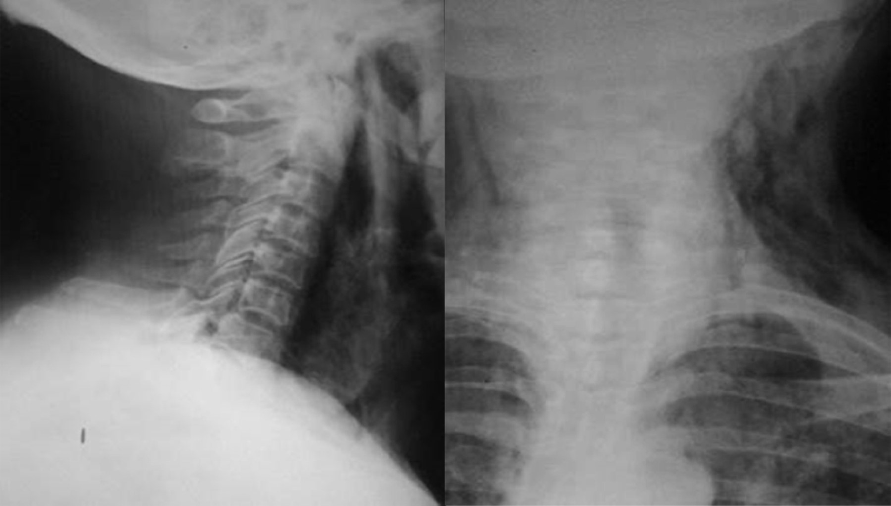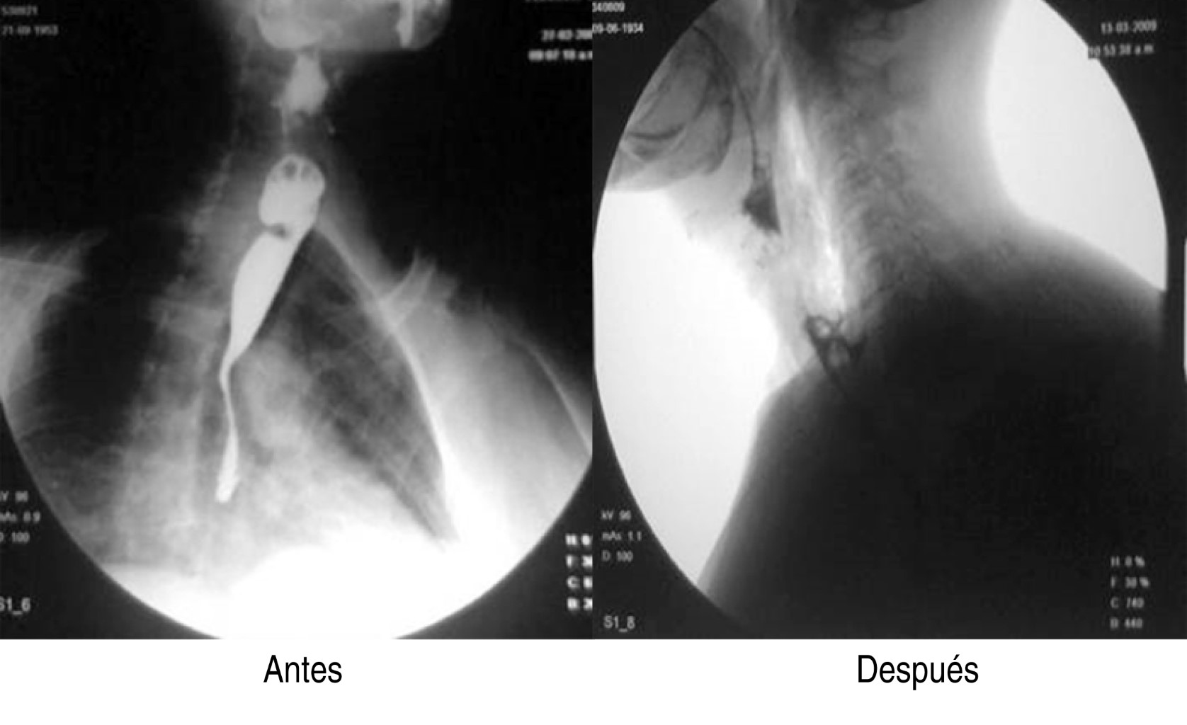Se realizaron en total 18 procedimientos, se consideró como complicación sólo un paciente (7.1%), quien presentó sangrado importante, mismo que se controló, pero impidió en el procedimiento inicial completar adecuadamente la miotomía, por lo que se reintervino a las 24 horas para completar ésta. Durante los procedimientos, dos pacientes tuvieron enfisema subcutáneo (un paciente femenino de 74 años y uno masculino de 57 años), los cuales fueron tratados de forma conservadora mediante la administración de una cefalosporina de tercera generación, así como control radiográfico para medición del enfisema subcutáneo (Figura 6). No se presentaron complicaciones mayores como mediastinitis, hemorragia incoercible o perforación que requirieran cambiar el tratamiento endoscópico por el quirúrgico de urgencia o programado. La mejoría de la disfagia en todos los casos fue inmediata y en las consultas subsecuentes refirieron haber aumentado de peso, además se realizó endoscopia y trago de material de control (Figura 7).
