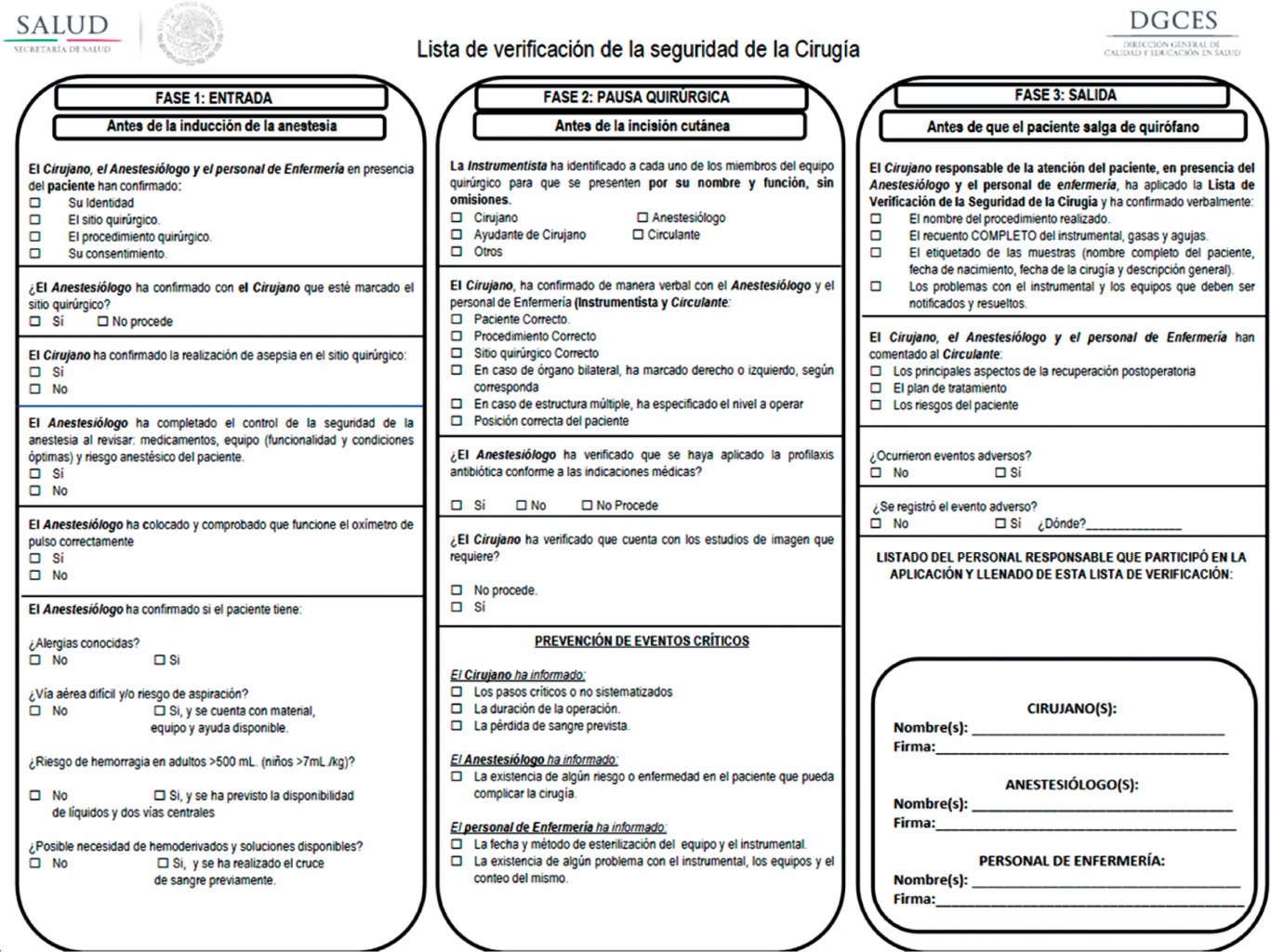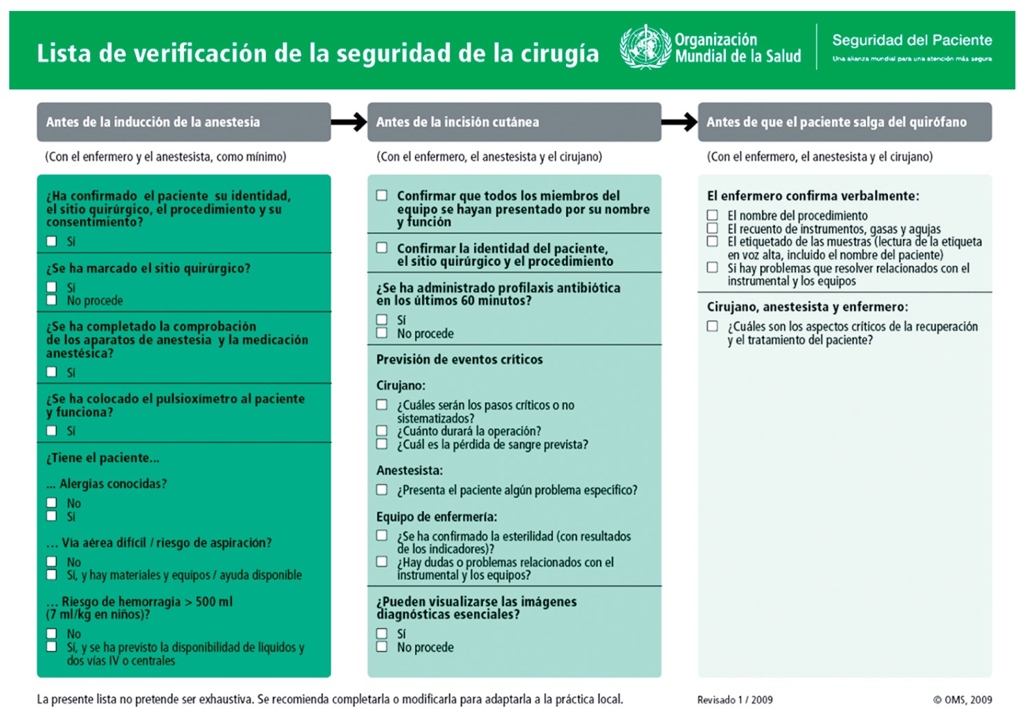 Organización Mundial de la Salud (OMS). Alianza mundial para la seguridad del paciente. Lista OMS de verificación de la seguridad de la cirugía. Manual de aplicación. 1a ed. [Internet]. Ginebra, Suiza; 2008. Disponible en: https://apps.who.int/iris/bitstream/handle/10665/70083/WHO_IER_PSP_2008.05_spa.pdf;jsessionid=23E7356DD2A7A802A2F65B0F16D11124?sequence=1 [Consulta del 1 de octubre de 2019].