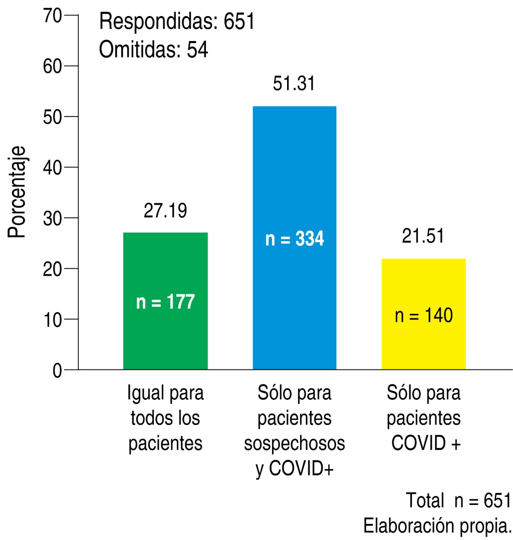 Por otro lado, los encuestados manifiestan que la prueba diagnóstica polimerasa de reacción en cadena (PCR) como medición preoperatoria sólo se realiza en 1.22%; pese a que se ha recomendado realizar pruebas diagnósticas PCR y/o tomografía axial de tórax (cirugía de urgencia) a todos los pacientes que vayan a ser intervenidos con propósito de seleccionar el mejor tratamiento disponible para el paciente, y cuando ya esté infectado evitar un agravamiento de su situación respiratoria, debido a la intubación y a la agresión quirúrgica; además, favorece la elección de la vía de abordaje (laparoscopia o laparotomía) y para que el personal de salud tome las medidas de protección necesarias para evitar los posibles contagios, ya que existen reportes de positividad en cirujanos de 23.5% y residentes 26.6%.30-32