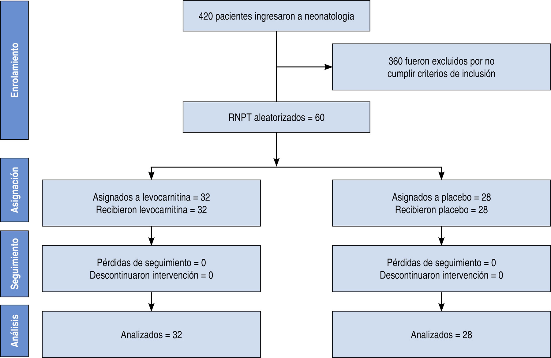 El tamaño muestral requerido se completó entre enero de 2006 y febrero de 2007. Una vez aleatorizados, 32 RNPT recibieron levocarnitina y 28 solución glucosada al 5%. Ningún paciente fue eliminado del estudio y el código de cada paciente se mantuvo cegado hasta que se concluyó el análisis de los datos (Figura 1).