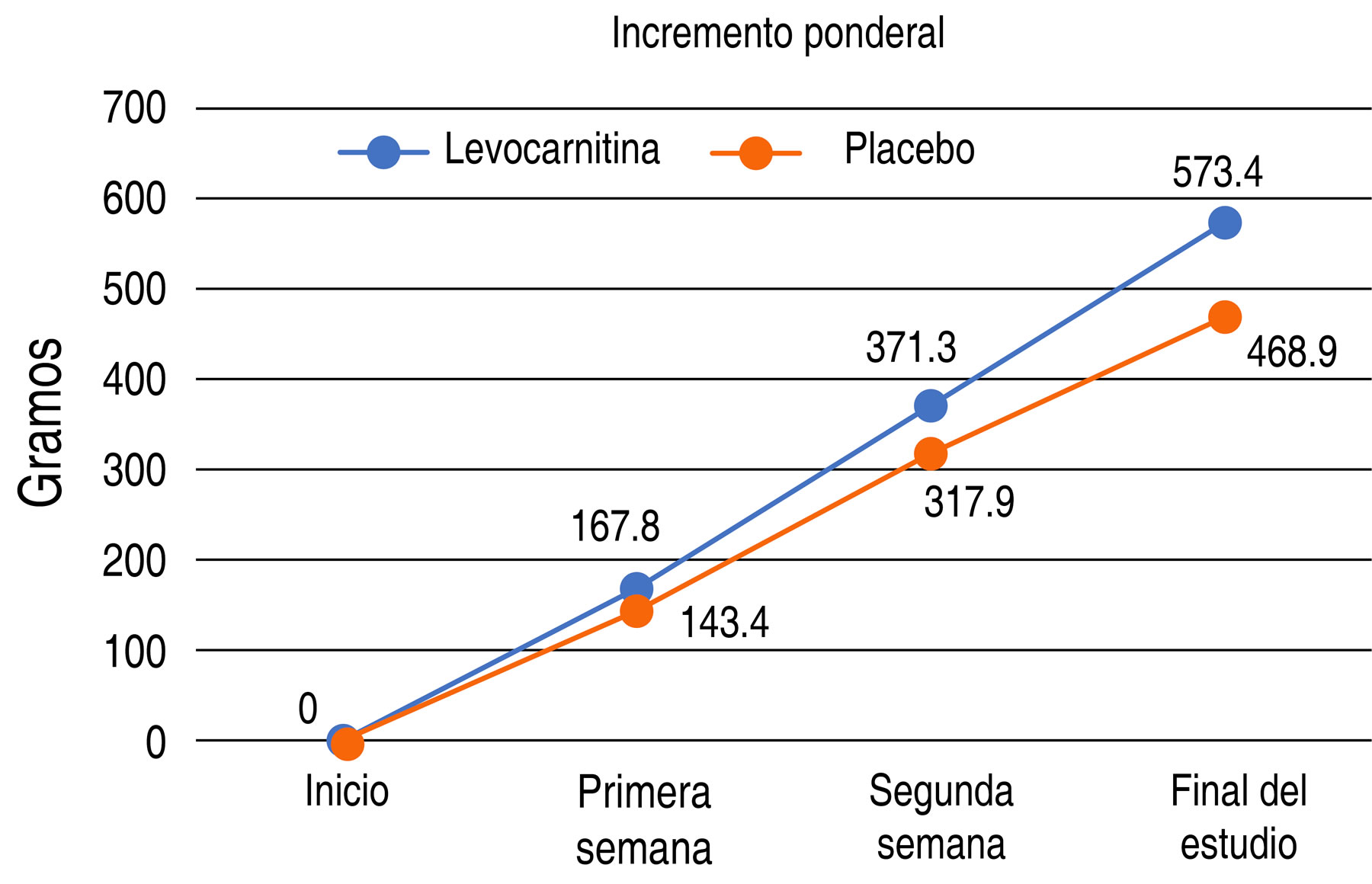 En los dos grupos, el peso mostró un patrón uniforme hacia el incremento por día. Sin embargo, fue mayor en el grupo que recibió levocarnitina (104.5 g) con una ganancia ponderal total en promedio de 573.4 g, en comparación a 468.9 g del grupo placebo (Figura 2). Asimismo, el incremento de peso promedio diario fue mayor en el grupo de levocarnitina que el del grupo control, 27.29 g vs 4.97 g.