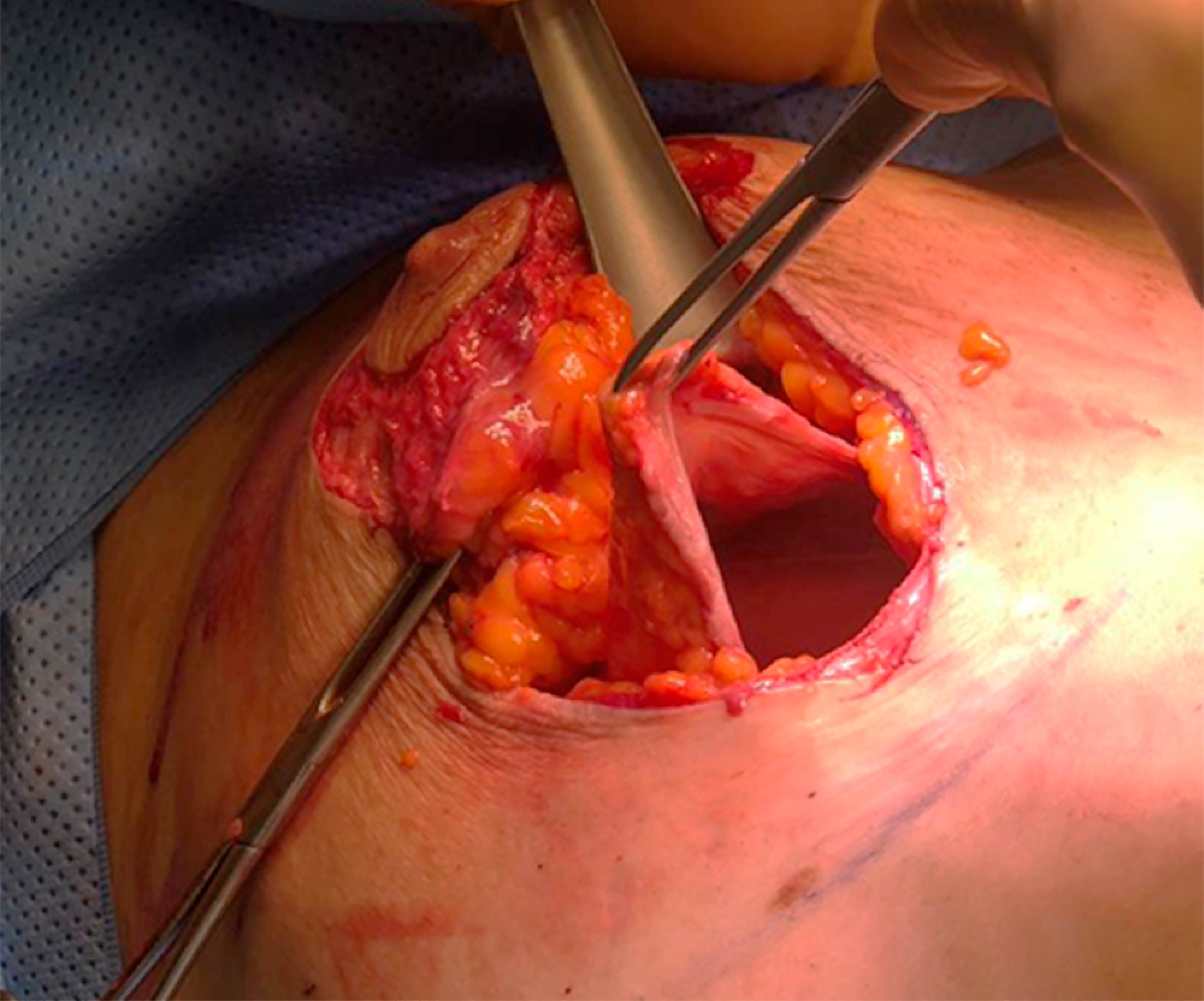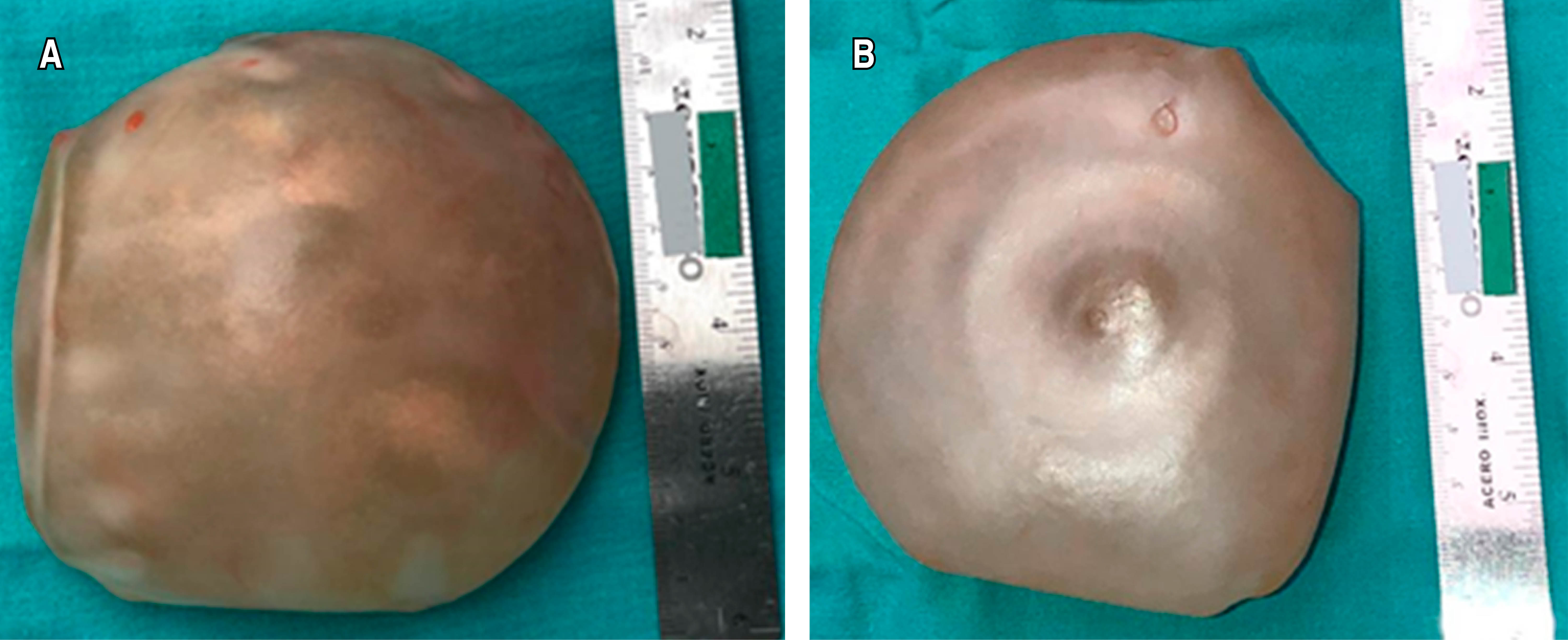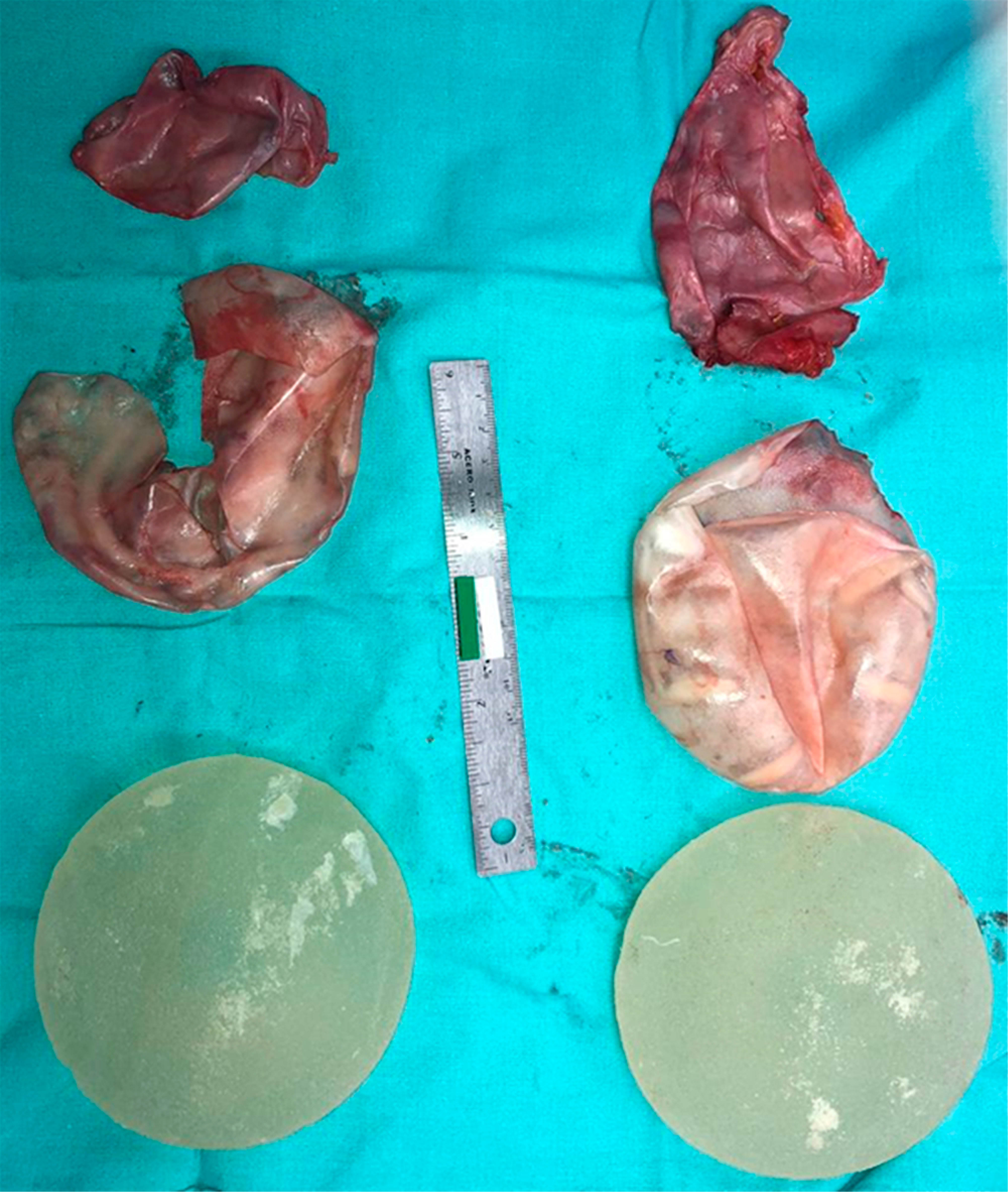 Acude a consulta para valoración médica por presencia de dolor en ambas mamas y ptosis mamaria bilateral; se decide plan de capsulotomía más cambio de implantes con mastopexia mamaria, además de complementar con abdominoplastia y liposucción de flancos en segundo tiempo quirúrgico. Durante el procedimiento se realiza abordaje por cicatriz de pexia previa, identificando cápsula, incidiendo y observando la presencia del implante cubierto por segunda cápsula, el cual se encontraba libre dentro de dicho bolsillo (Figura 1). Se extrae implante con cápsula íntegra y se realiza capsulotomía anterior únicamente, se deja porción posterior de la misma. Se aborda mama izquierda y observamos el mismo fenómeno. Al abrir la cápsula interna que contiene los implantes, encontramos implantes descritos en párrafo anterior sin datos de ruptura o exudado en su interior (Figura 2). Se procede a continuar con plan preestablecido y se colocan implantes de 220 g redondos texturizados de perfil alto marca Allergan TSF N-TSF, además de realizar el resto de los procedimientos programados, llevados a cabo de manera rutinaria y sin ninguna complicación o hallazgo distinto. La recuperación del caso se desarrolló de forma satisfactoria en las semanas posteriores al procedimiento quirúrgico.