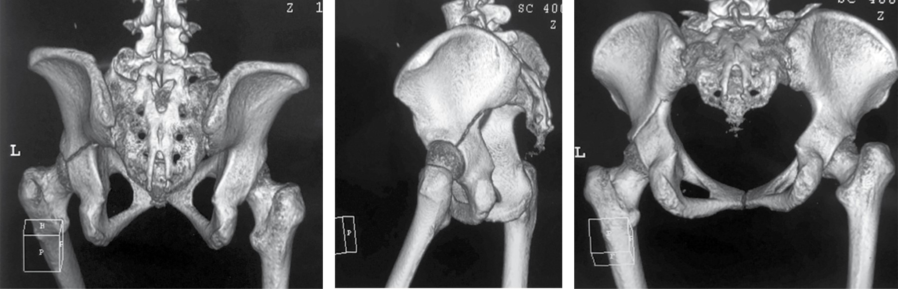 Femenino, de 38 años de edad, con antecedente de accidente automovilístico, con trauma e impacto indirecto en rodilla izquierda, causando dolor y limitación funcional de la extremidad pélvica izquierda; fue evaluada en urgencias sin lesiones multisistémicas asociadas. Se realizó toma de las proyecciones radiográficas simples y tomografía axial computada de pelvis, con reconstrucción en 3D (Figura 1). Se observó pérdida de continuidad ósea a nivel de línea iliopectínea, llegando al diagnóstico de fractura simple de acetábulo izquierdo AO 62-A2.2 que involucra la columna posterior.30