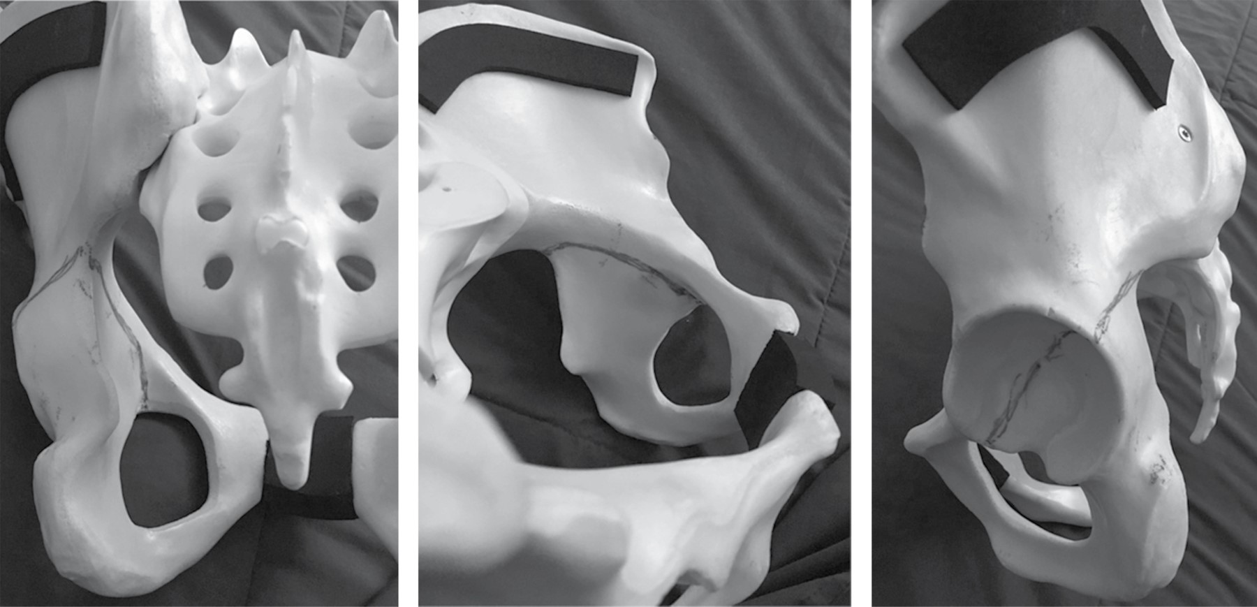 La paciente fue hospitalizada y programada para su manejo quirúrgico definitivo. Se realizó planificación en modelo plástico (Figura 2) y se decidió realizar reducción cerrada y fijación interna bajo principio biomecánico de compresión interfragmentaria31 y asistir reducción bajo visión directa mediante artroscopía de cadera.