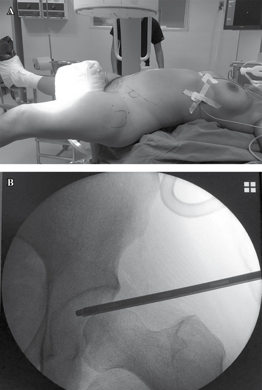 Técnica quirúrgica: bajo anestesia general controlada, se posicionó a la paciente en decúbito supino sobre mesa quirúrgica de reducción de fracturas con la extremidad pélvica en tracción, utilizando fluoroscopio para visualizar la articulación coxofemoral (Figura 3).