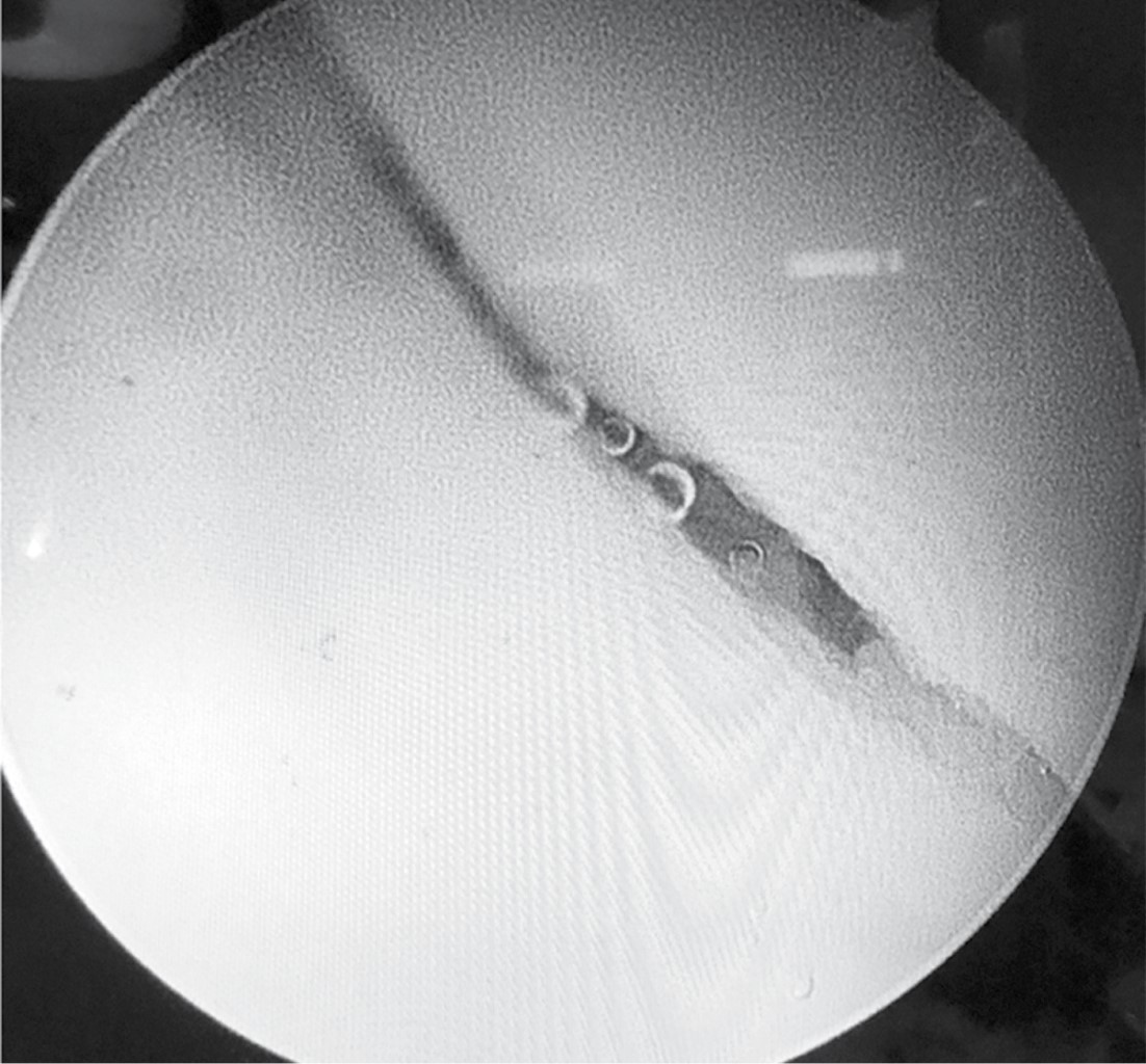 Al realizar la tracción de miembro pélvico izquierdo se logró la subluxación con apertura del espacio articular coxofemoral necesario para la introducción del material artroscópico. Por el portal anterolateral se introdujo el lente de 70 grados para visualización intraarticular. Se localizó con visión intraarticular el portal anterior estándar para introducción de material de trabajo. En la exploración articular se observó hemartrosis con sinovitis inflamatoria, se realizó lavado intraarticular y hemostasia, se extrajeron fragmentos libres de cartílago con punta de rasurador. Se localizó lesión traumática de labrum en región posterior acetabular, la cual se estabilizó con radiofrecuencia, se ubicó el trazo de fractura acetabular en columna posterior longitudinal simple con separación de 4 mm (Figura 4). Se realizó abordaje de 4 cm en primera ventana de Judet y se disecó por planos hasta localizar con guía canulada el punto de entrada para la colocación de tornillo de compresión, asistido por fluoroscopía de 7.0 mm por 85 mm y bajo visión directa intraarticular para observar el cierre del trazo de fractura con congruencia articular satisfactoria (Figura 5). Finalmente se procedió a la extracción de instrumental artroscópico y cierre de heridas por planos.