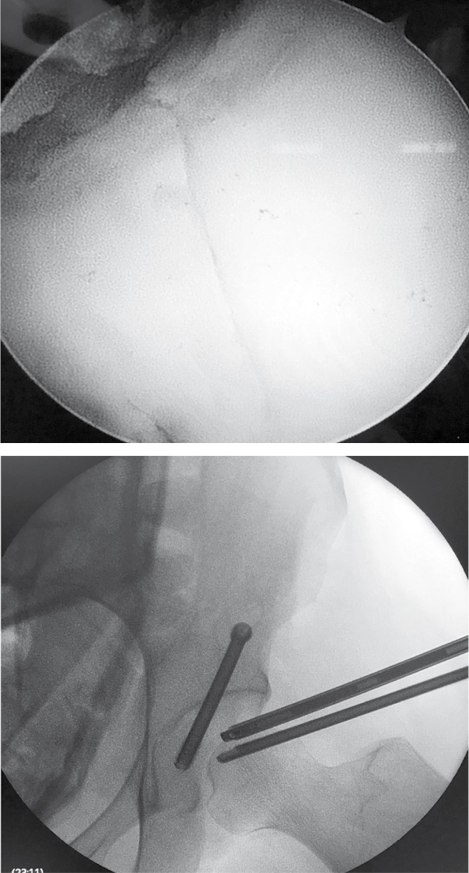 En 2003, Yamamoto reporta un caso de fijación percutánea asistida por artroscopía en una fractura acetabular en zona de carga.21 Yang posteriormente informó sobre dos casos de fracturas de la columna anterior tratadas con reducción indirecta asistida por artroscopía y fijación percutánea,24 reportando consolidación y ausencia de cambios artrósicos en un seguimiento a tres años. En 2014, Kim y colaboradores informaron dos casos de reducción y fijación interna artroscópica en dos pacientes jóvenes con fractura de pared posterior y de la columna anterior, respectivamente, con seguimiento postoperatorio a tres meses, asintomáticos y reintegrados a las actividades, con consolidación radiográfica completa a los dos años.23 En 2016 Chung refiere que la fijación percutánea mediante fluoroscopio con asistencia artroscópica puede ser más útil en pacientes con traumatismos múltiples, reportaron dos casos de fractura de la pared posterior acetabular, tratados mediante reducción artroscópica y fijación percutánea de tornillos, concluyendo que la técnica es útil para reducir el dolor postoperatorio y lograr el retorno temprano a las actividades para el paciente.22