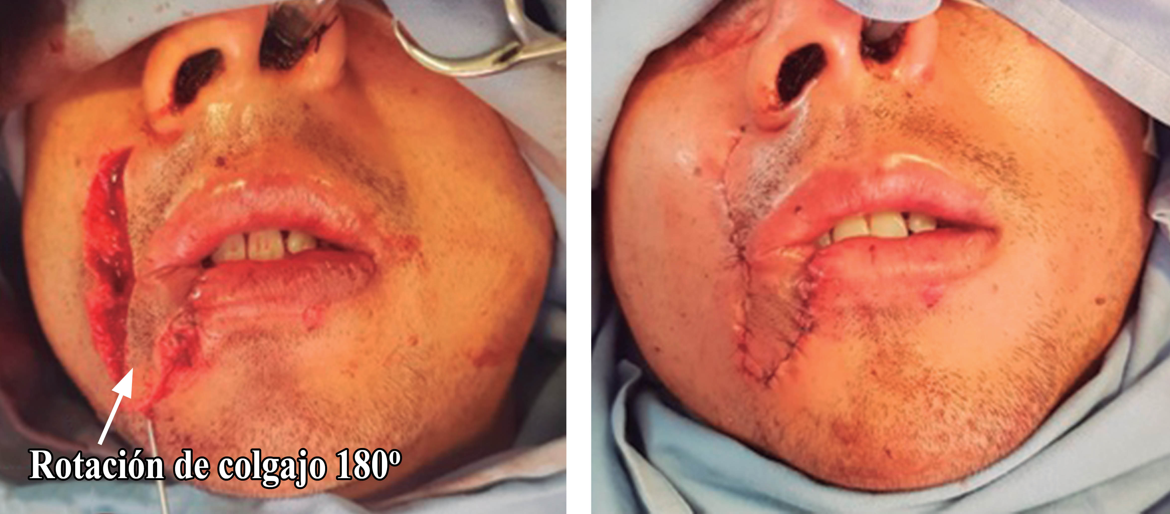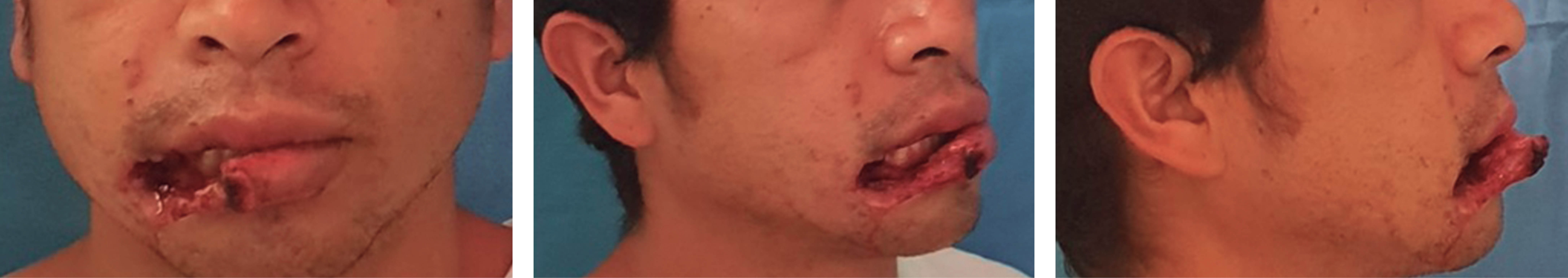 Hombre de 33 años de edad que inició padecimiento cuando se encontraba con unos amigos tomando bebidas alcohólicas; empezaron a discutir y uno de sus compañeros lo mordió, ocasionando avulsión de la unidad estética del labio inferior (Figura 1). En quirófano se realizó marcaje quirúrgico, identificando la longitud del colgajo basado en la mitad de la longitud del defecto así como la altura del defecto con el mismo margen para el alto del colgajo (Figura 2). Se procedió a desbridar zona receptora, e identificar planos. Se realizó incisión con bisturí frío de todos los espesores (piel, músculo orbicular y mucosa), seccionándolos por completo, posteriormente en el borde interno del labio se realizó la resección hasta antes de llegar al bermellón, respetando la línea blanca; se rotó el colgajo 180o (Figura 3) y se cerró por planos, iniciando a nivel de mucosa oral con Vicryl 3-0 después el músculo orbicular, se identificó la nueva comisura y se fijó al modiolo. Se afrontó el tejido celular subcutáneo con Vicryl 4-0 y la piel con nylon 5-0. El resultado quirúrgico a los siete días y a los seis meses fue satisfactorio (Figura 4).